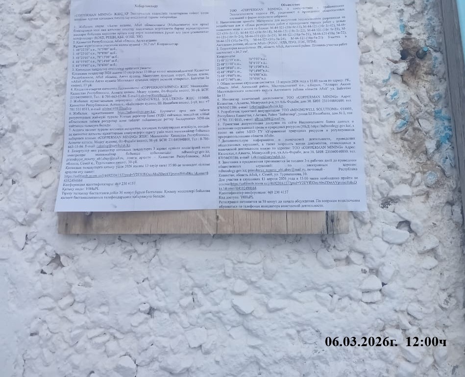 6. Объявление о проведении общественных слушаний на казахском и русском языках будет распространено следующими способами: