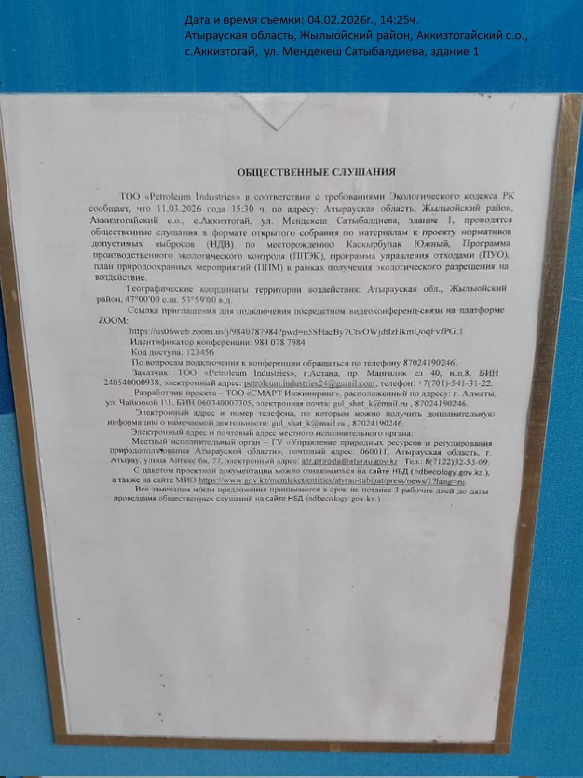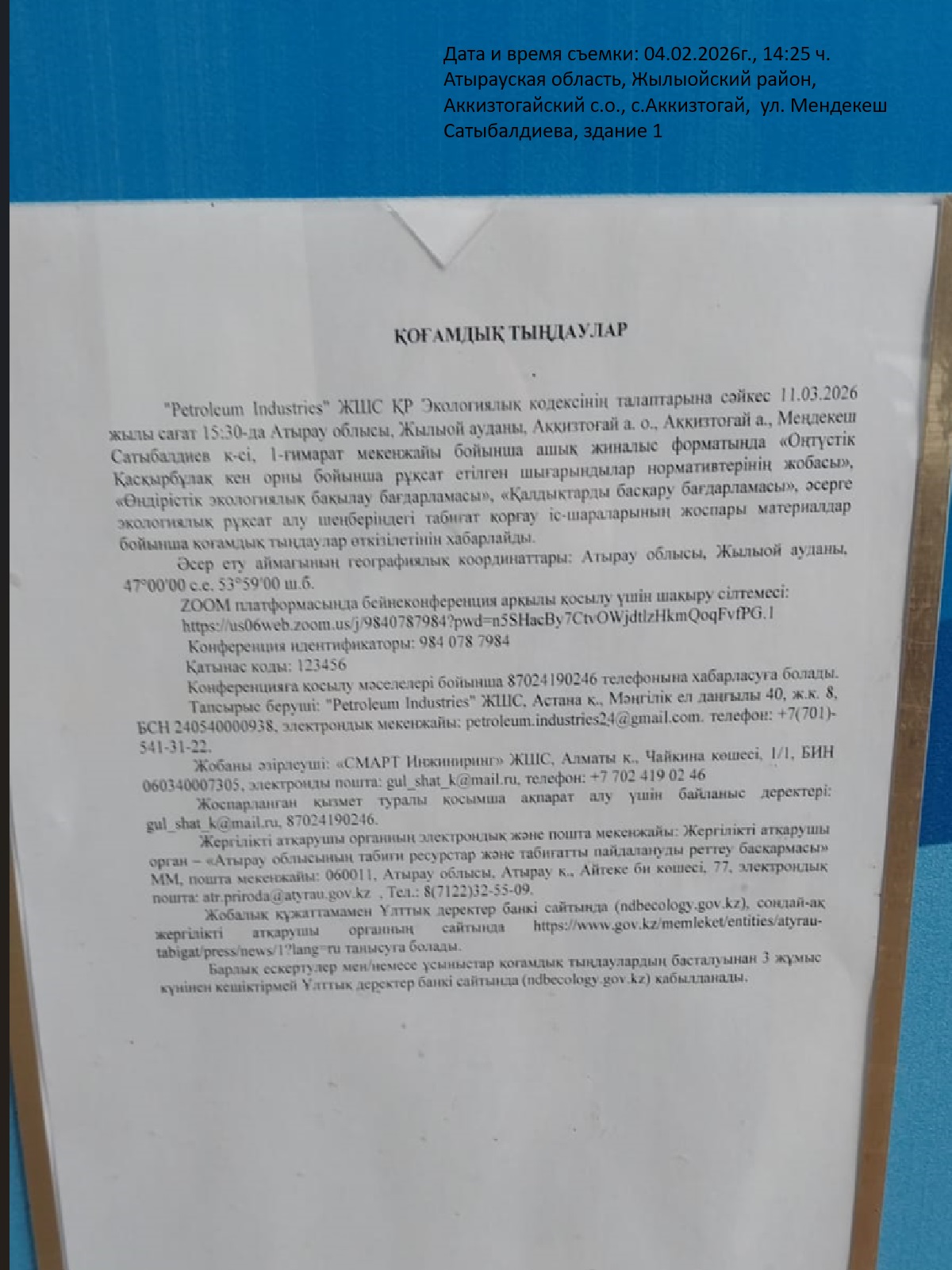 3. Общественные слушания организованны: Управление природных ресурсов и регулирования природопользования Атырауской области, atr.priroda@atyrau.gov.kz,