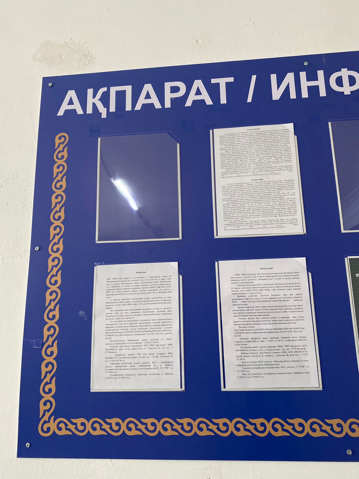 6.3. расположение мест, специально предназначенных для Размещения печатных объявлений (доски объявлений): Павлодарская область, Баянаульский район, Майкаинская п.а., п.Майкаин, ул. Астана 52 (Акимат)