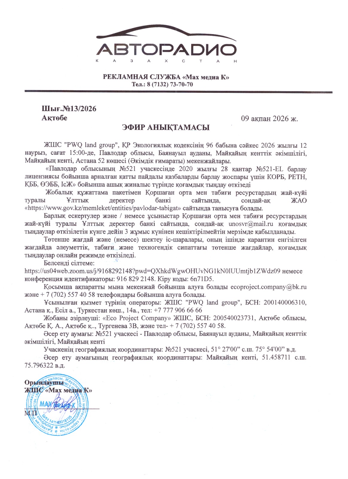 6.2. Наименование теле или радиоканала, где будет размещено объявление: Авторадио Казахстан