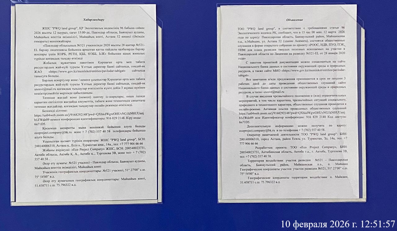 4. Повестка дня общественных слушаний: Настоящий план разведки на участке Разведки по Лицензии на разведку твердых полезных ископаемых №521-EL от “28” января 2020 года. Участок расположен в Палодарской области, лицензионная территория расположена в Баянаульском районе Павлодарской области в 4 км восточнее села Майкайын. Лицензия выдана ТОО «PWQ Land Group», расположенному по адресу Республика Казахстан, г.Астана, район Есиль, улица Туркестан, здание 14а. Размер в праве недропользования 100%. Лицензия выдана Министерством индустрии и инфраструктурного развития Республики Казахстан. Лицензия выдана на разведку твердых полезных ископаемых. Сведения по лицензии: 1. Название лицензии – Лицензия на разведку твердых полезных ископаемых №521-EL от “28” января 2020 года; 2. Количество блоков по лицензии – 8; 3. Дата выдачи - “28” января 2020 года; Активная ссылка проводимых общественных слушаний https://us04web.zoom.us/j/9168292148?pwd=QXhkdWgwOHUvNG1kN0lUUmtjb1ZWdz09 или Идентификатор конференции: 916 829 2148 Код доступа: 6n71D5.