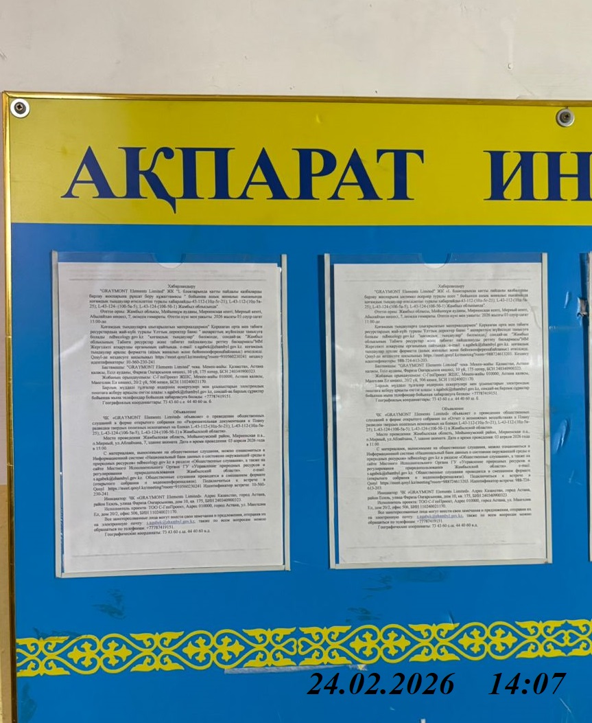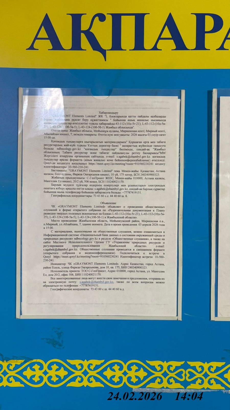 1.4. Описание для подключения к онлайн трансляции при прохождении общественного слушания: Приглашение на запланированную встречу в Qosyl Тема встречи: ЧК GRAYMONT ELEMENTS LIMITED Время встречи: 03.04.2026 15:00 Длительность встречи: 01 час. Идентификатор встречи: 910-560-230-241 Подключиться к встрече в Qosyl: https://meet.qosyl.kz/meeting?room=910560230241