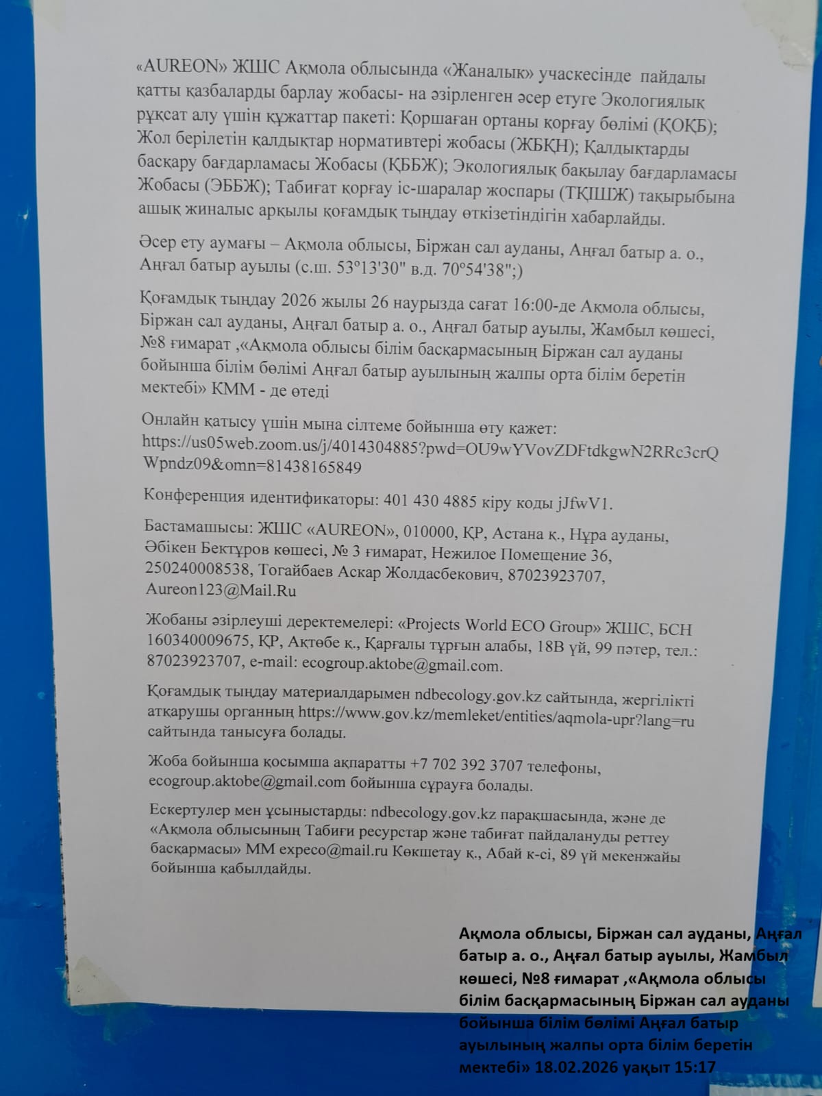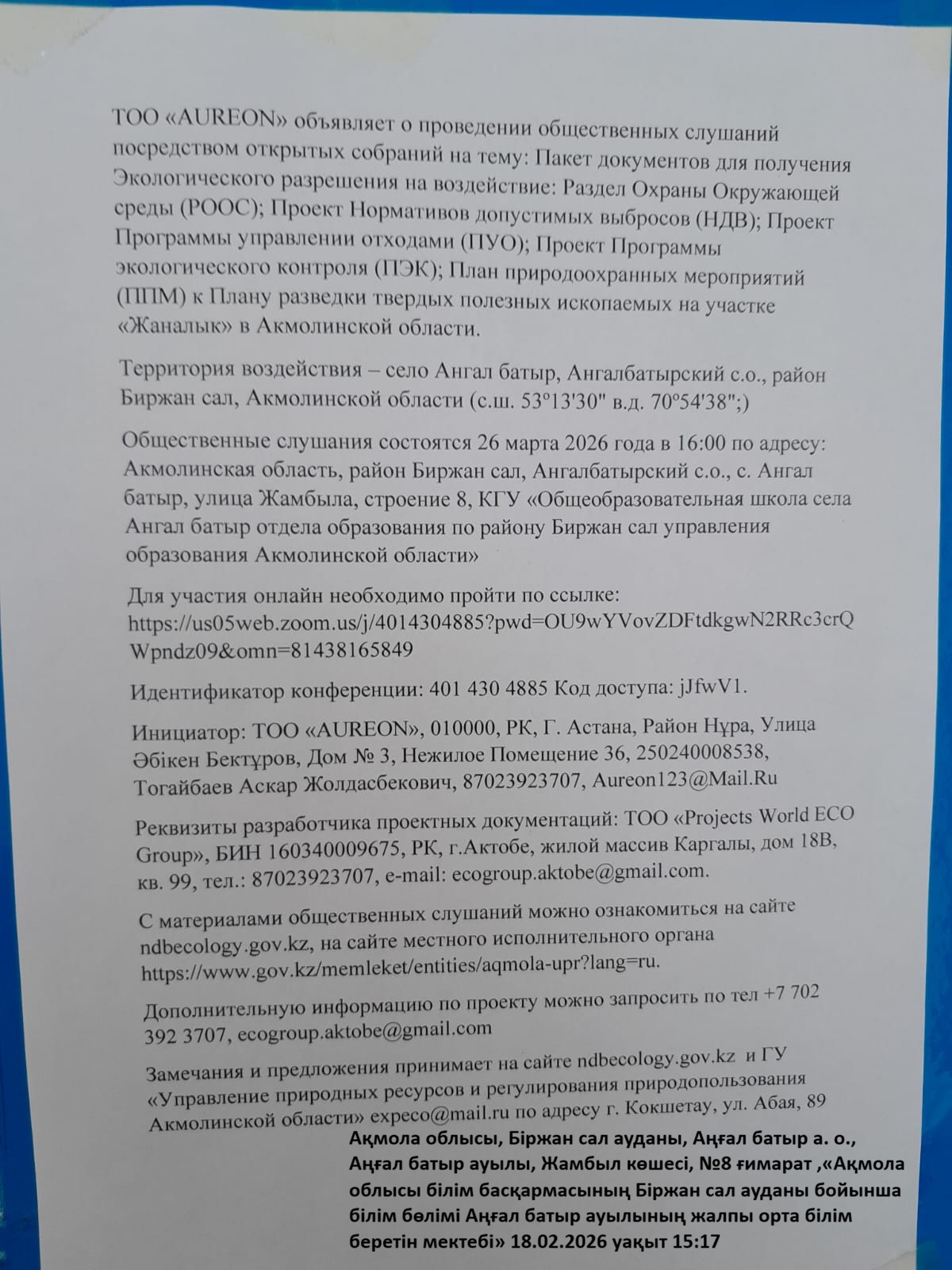 3. Общественные слушания организованны: Управление природных ресурсов и регулирования природопользования Акмолинской области, expeco@mail.ru,