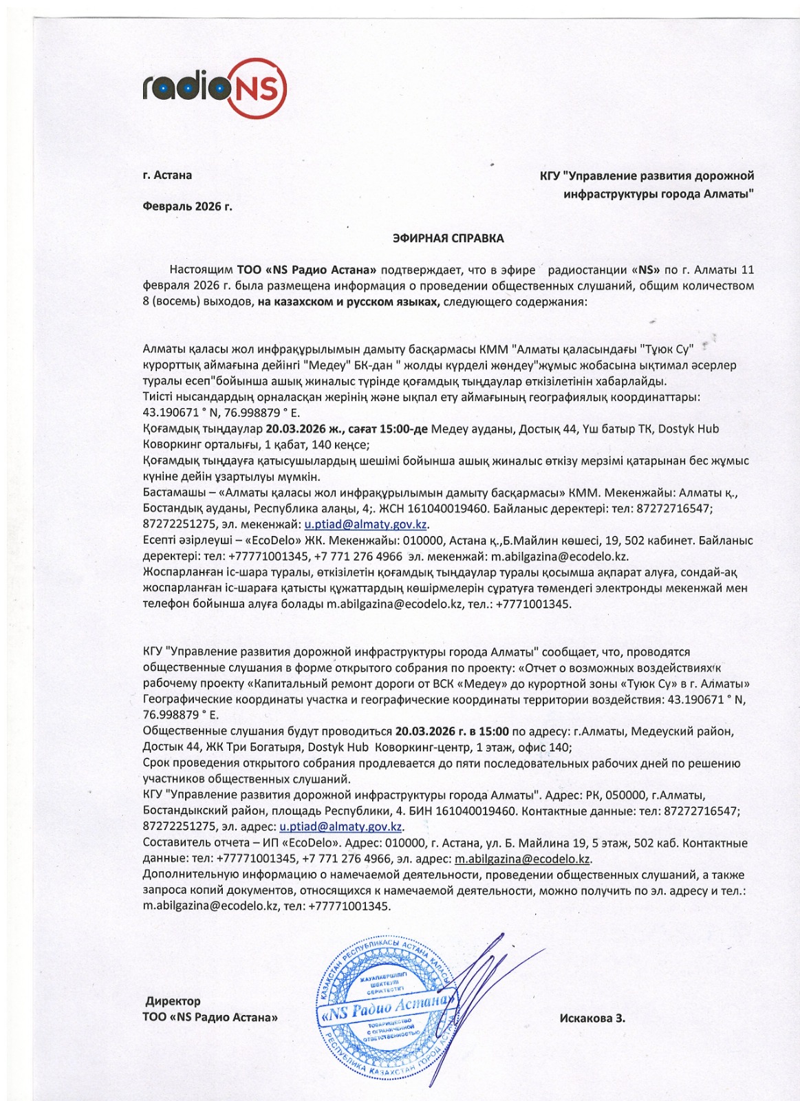 3. Общественные слушания организованны: Управление зеленой экономики города Алматы, uprirp@mail.ru,
