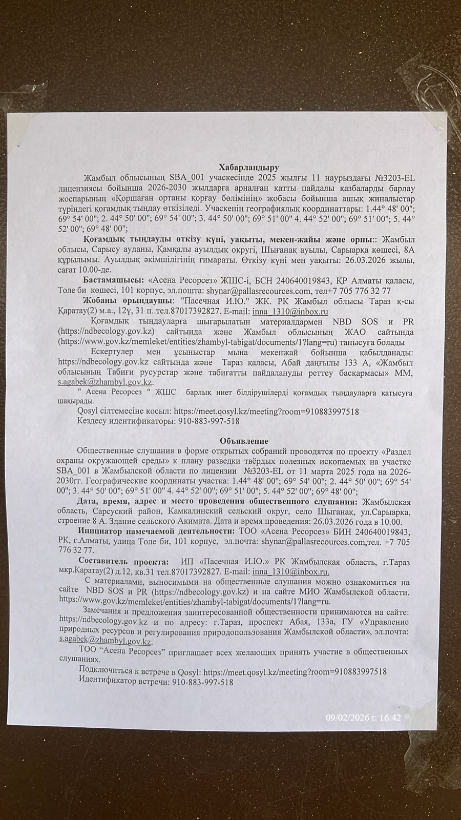 3. Общественные слушания организованны: Управление природных ресурсов и регулирования природопользования Жамбылской области, s.agabek@zhambyl.gov.kz,