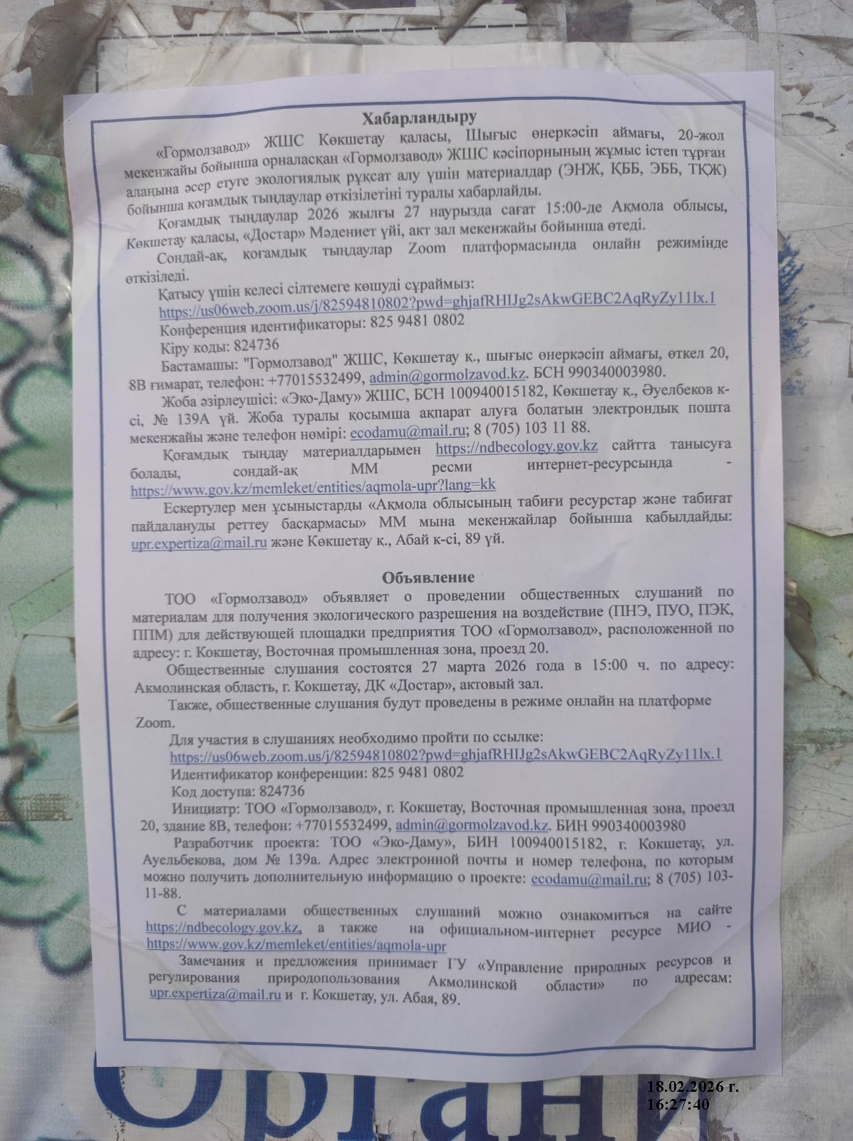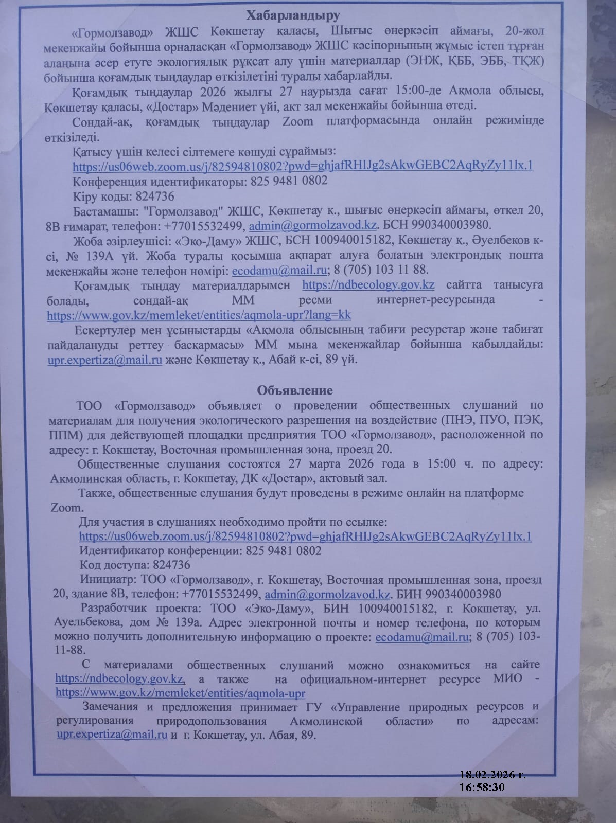 3. Общественные слушания организованны: Управление природных ресурсов и регулирования природопользования Акмолинской области, expeco@mail.ru,