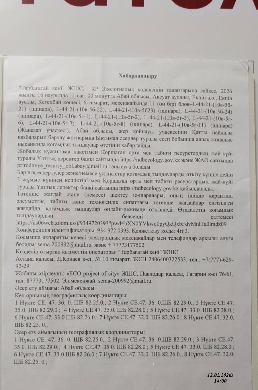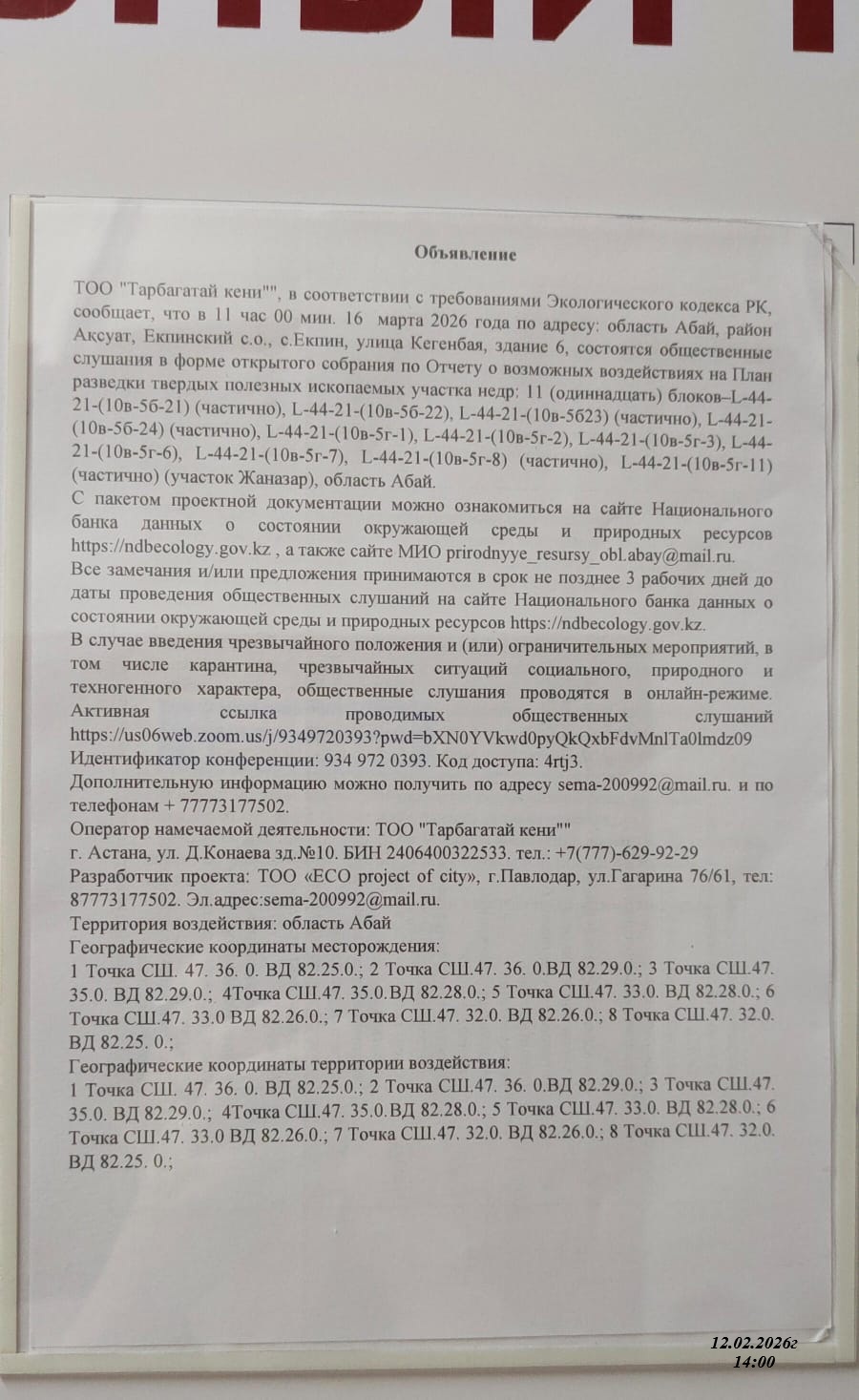 4. Повестка дня общественных слушаний: Отчет о возможных воздействиях на План разведки твердых полезных ископаемых участка недр: 11 (одиннадцать) блоков–L-44-21-(10в-5б-21) (частично), L-44-21-(10в-5б-22), L-44-21-(10в-5б23) (частично), L-44-21-(10в-5б-24) (частично), L-44-21-(10в-5г-1), L-44-21-(10в-5г-2), L-44-21-(10в-5г-3), L-44-21-(10в-5г-6), L-44-21-(10в-5г-7), L-44-21-(10в-5г-8) (частично), L-44-21-(10в-5г-11) (частично) (участок Жаназар), область Абай.В случае введения чрезвычайного положения и (или) ограничительных мероприятий, в том числе карантина, чрезвычайных ситуаций социального, природного и техногенного характера, общественные слушания проводятся в онлайн-режиме. Активная ссылка проводимых общественных слушаний https://us06web.zoom.us/j/9349720393?pwd=bXN0YVkwd0pyQkQxbFdvMnlTa0lmdz09 Идентификатор конференции: 934 972 0393. Код доступа: 4rtj3.