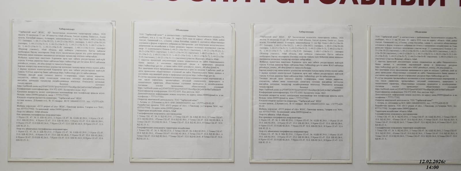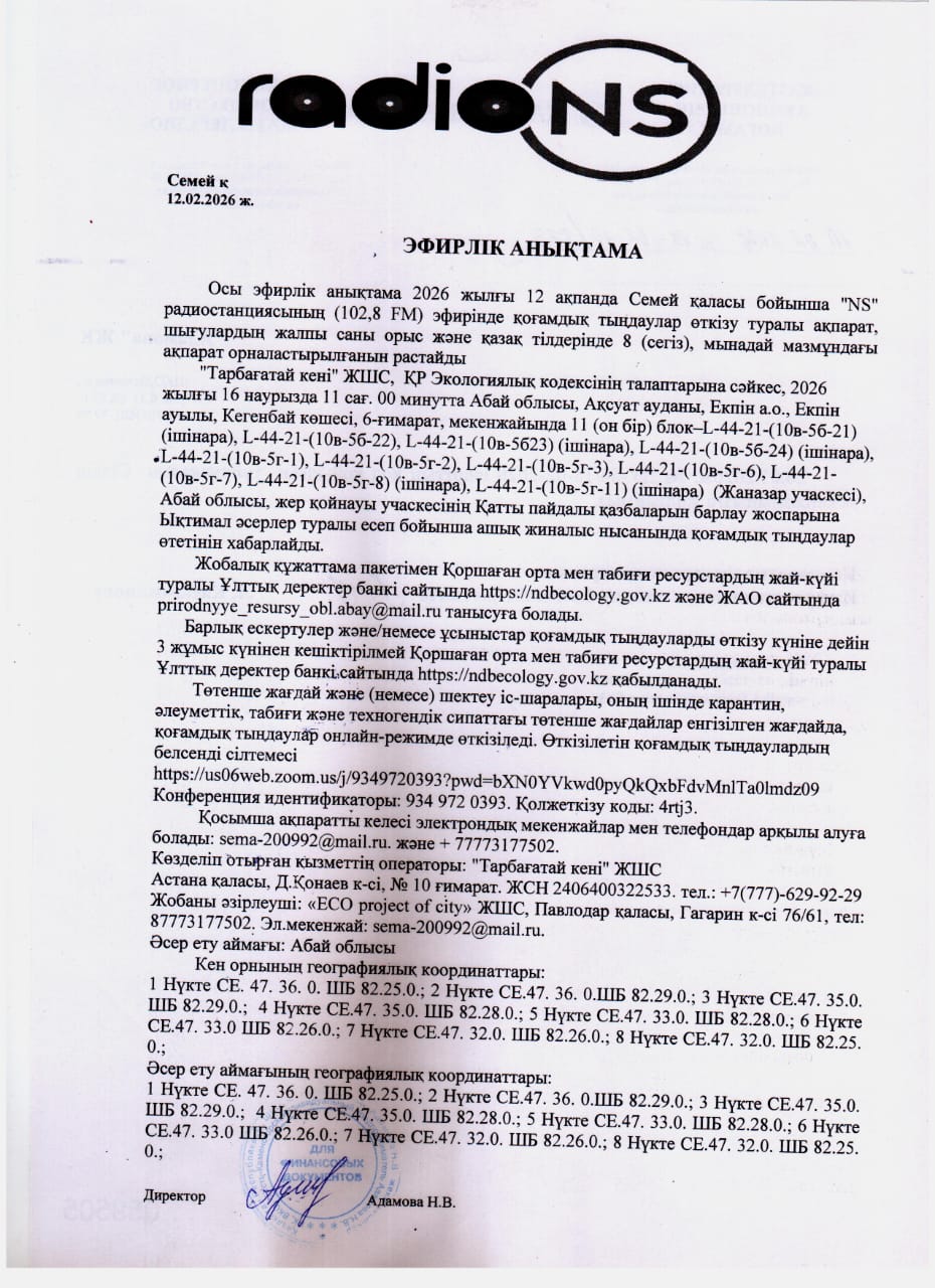 3. Общественные слушания организованны: Главный специалист УПР и ПР область Абай, prirodnyye_resursy_obl.abay@mail.ru,