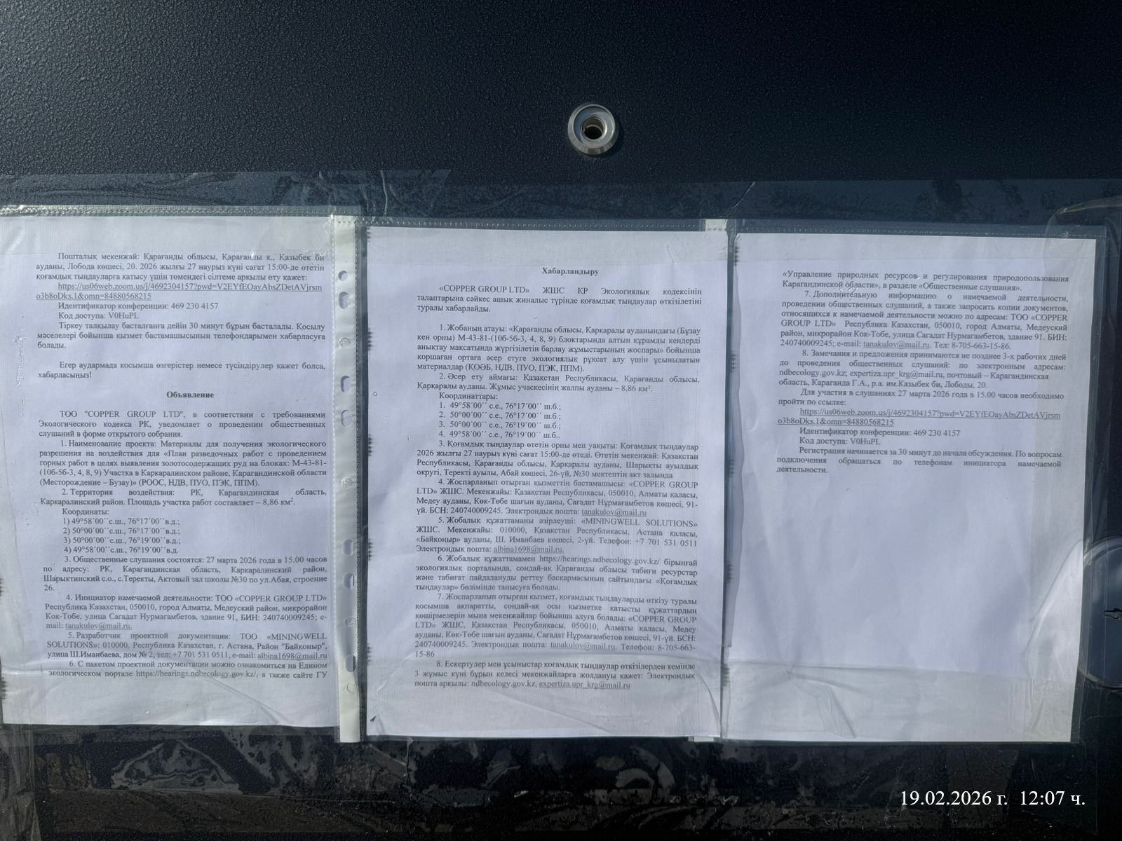 3. Общественные слушания организованны: Управление природных ресурсов и регулирования природопользования Карагандинской области, expertiza.upr_krg@mail.ru,