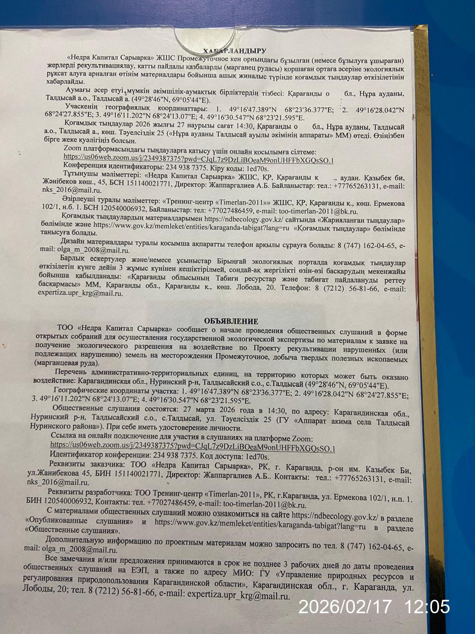 3. Общественные слушания организованны: Управление природных ресурсов и регулирования природопользования Карагандинской области, expertiza.upr_krg@mail.ru,