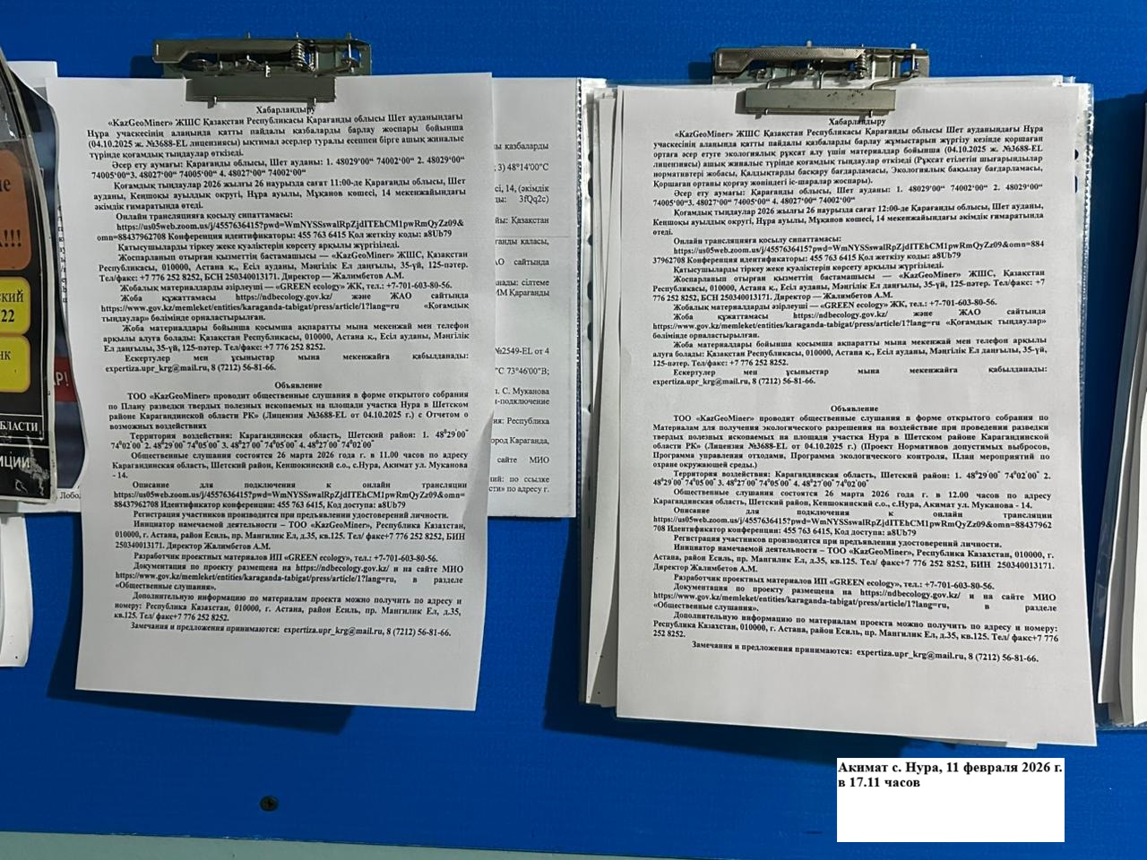 3. Общественные слушания организованны: Управление природных ресурсов и регулирования природопользования Карагандинской области, expertiza.upr_krg@mail.ru,