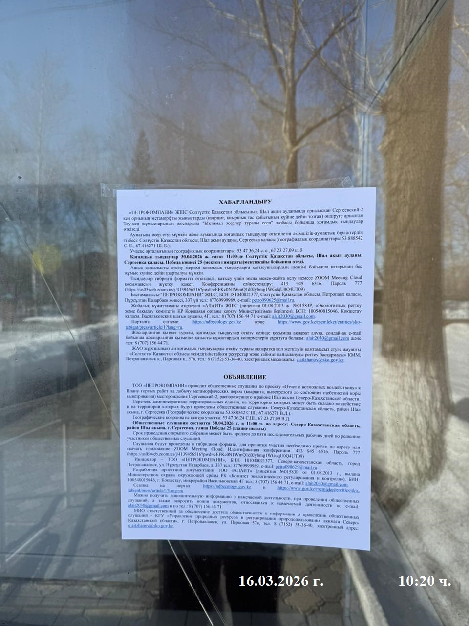 3. Общественные слушания организованны: Управление природных ресурсов и регулирования природопользования Северо-Казахстанской области, e.aitzhanov@sko.gov.kz,