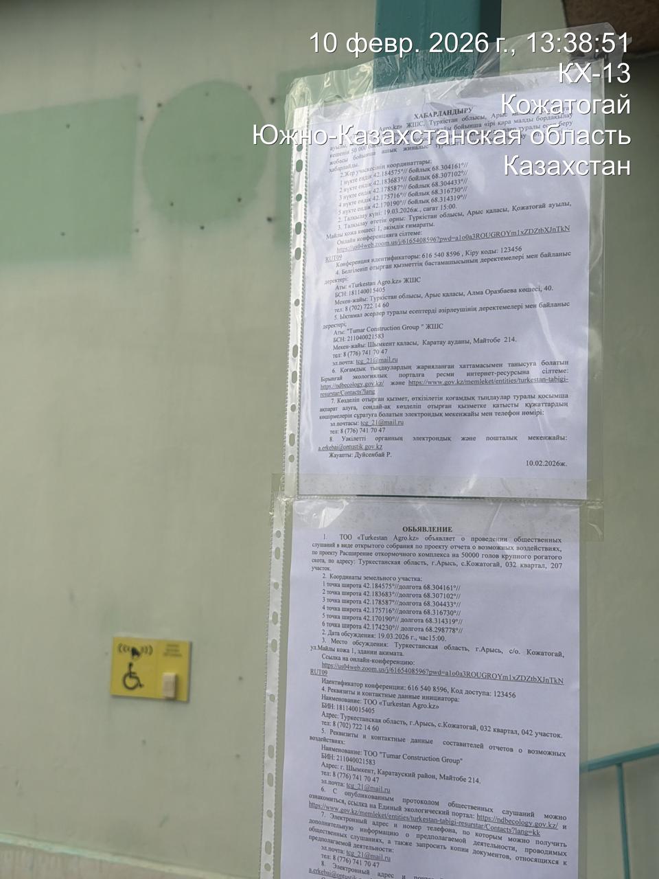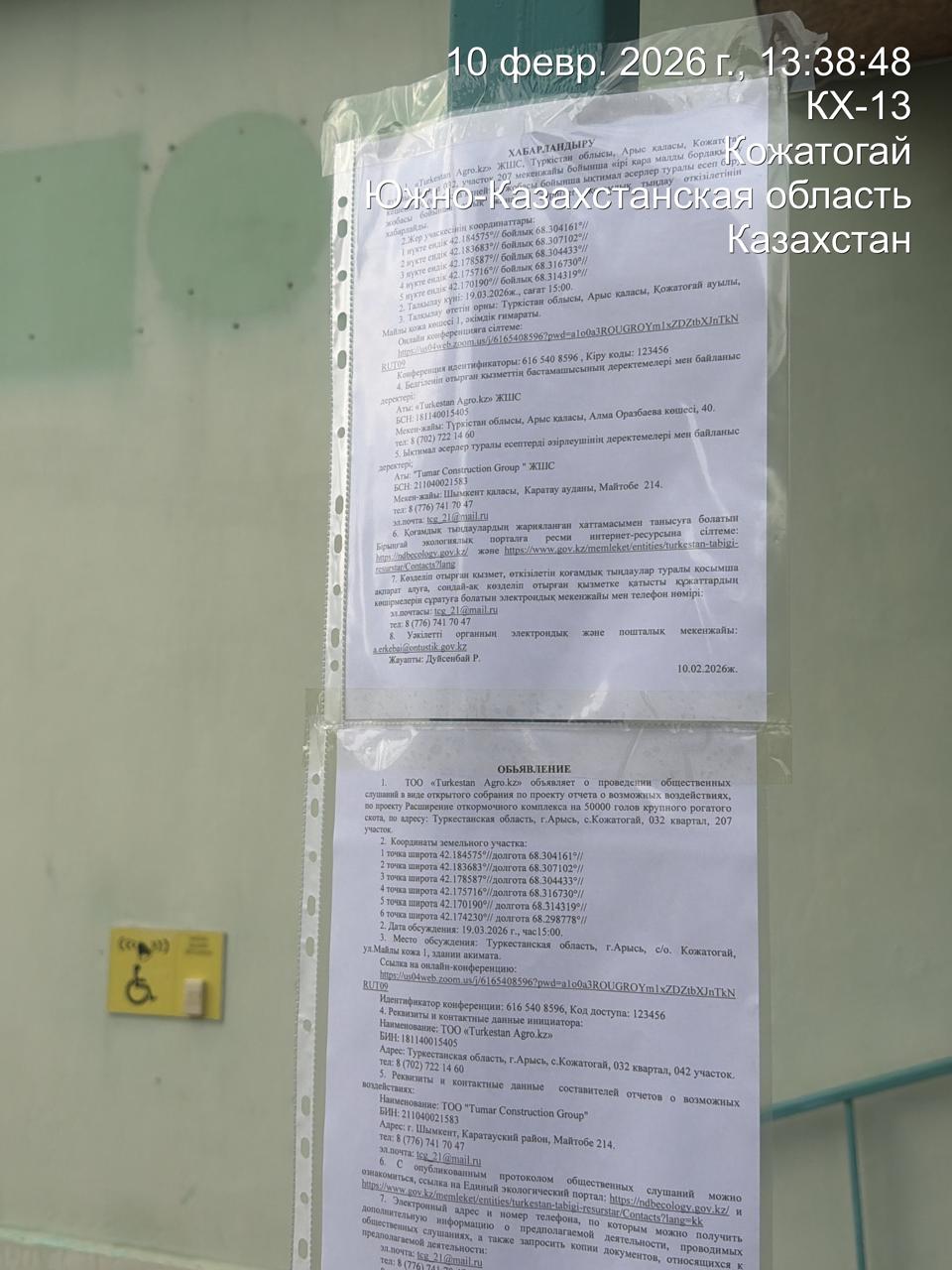 3. Общественные слушания организованны: Управление природных ресурсов и регулирования природопользования Туркестанской области, a.erkebai@ontustik.gov.kz,