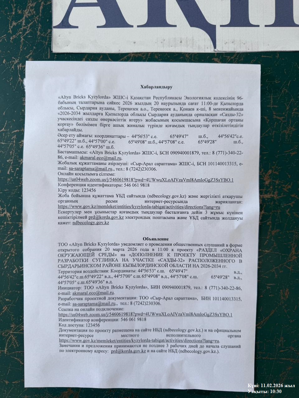3. Общественные слушания организованны: Управление природных ресурсов и регулирования природопользования Кызылординской области, prd@korda.gov.kz 87242605362, 605369,
