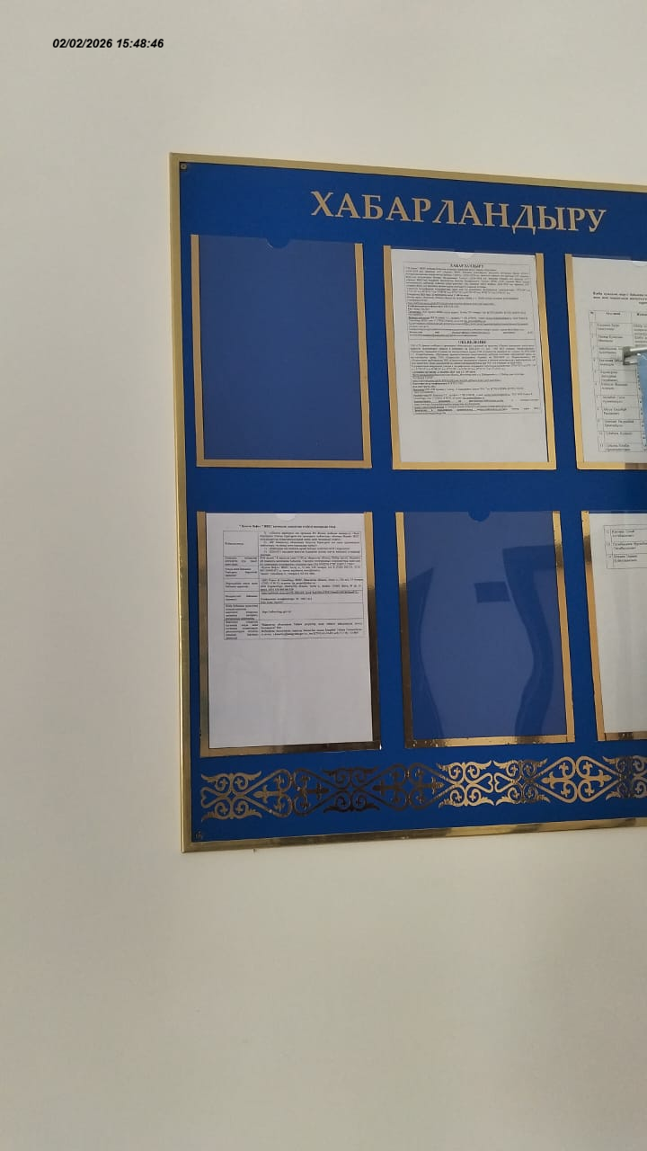6.3. расположение мест, специально предназначенных для Размещения печатных объявлений (доски объявлений): Доска объявлений здания Акимата
