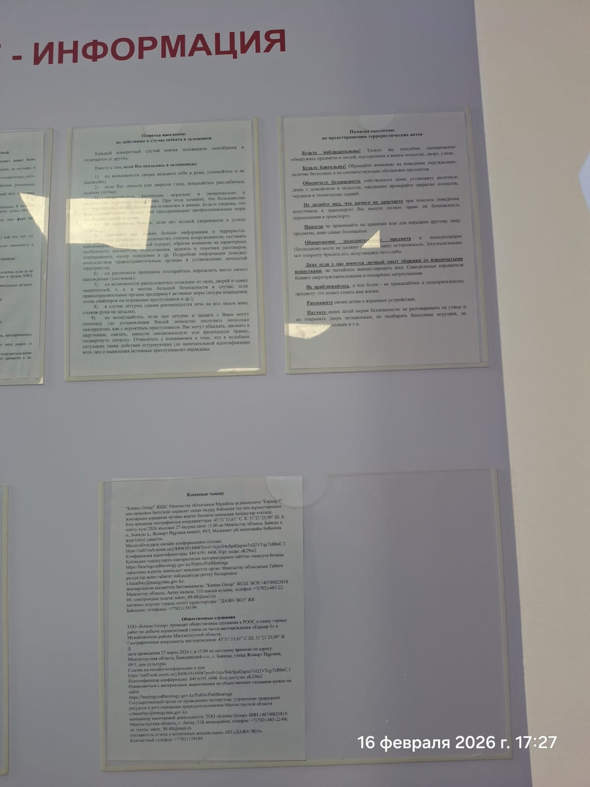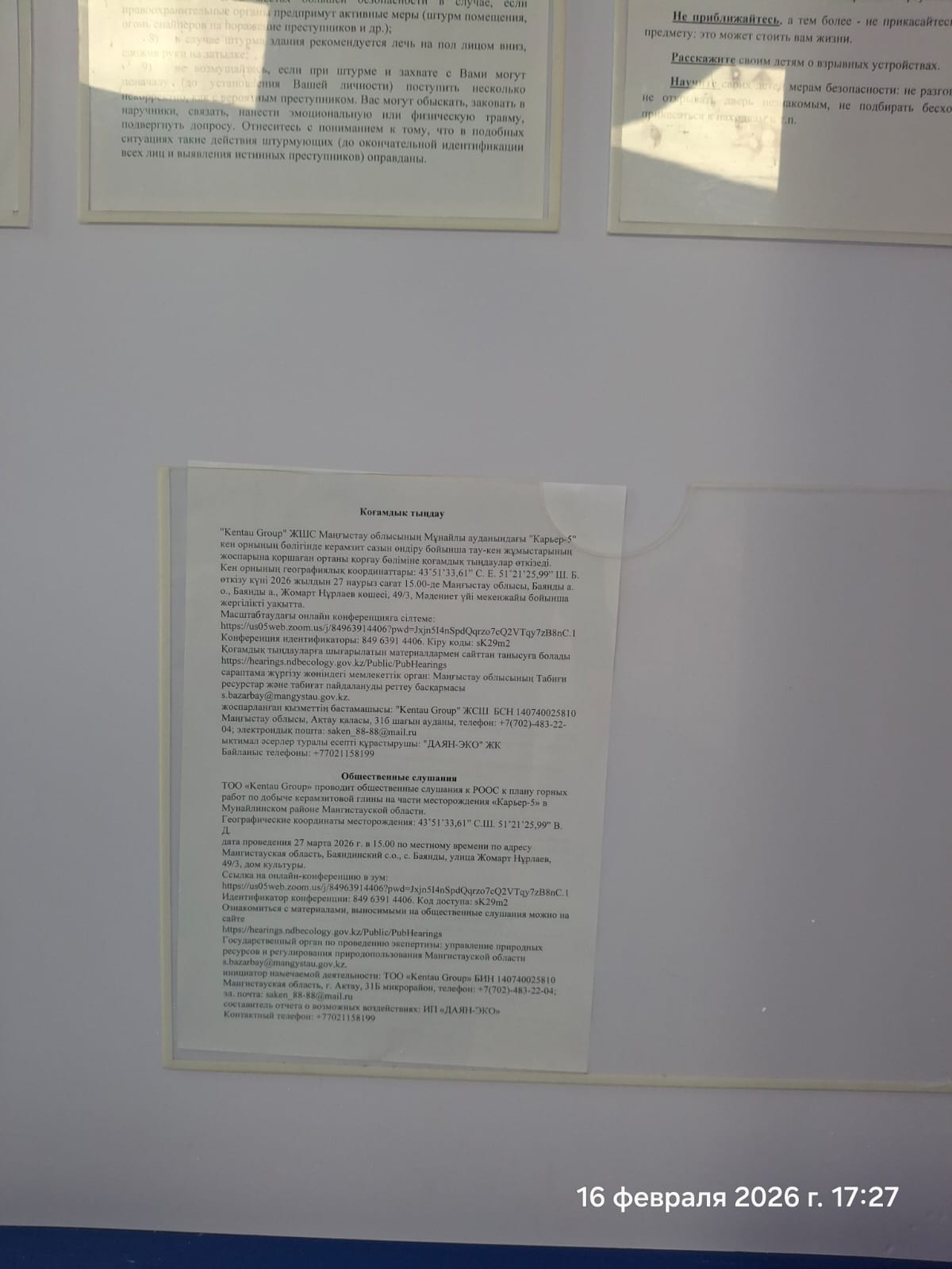 4. Повестка дня общественных слушаний: ТОО «Kentau Group» проводит общественные слушания к РООС к плану горных работ на добычу керамзитовой глины на части месторождения «Карьер-5» в Мунайлинском районе Мангистауской области. Балансовые запасы глин в пределах испрашиваемой лицензионной площади - части месторождения керамзитовых глин месторождения «Карьер-5» по состоянию на 01 января 2021 года составляют (тыс.м3): по категории В – 14427,8. Характерной особенностью месторождения «Карьер-5» является значительная мощность вскрышных пород (супесей, суглинков, глин), объем которой на всей запрашиваемой лицензионной площади составляет 3624,0 тыс.м3. Однако согласно указанной техническим заданием ежегодной добычи, в лицензионный десятилетний срок планируется произвести добычу керамзитовых глин в объеме – 1500,0 тыс.м3. Ввиду того, что в восточной части площади месторождения ранее производились добычные работы и в результате были здесь сняты вскрышные породы, мощность которых значительная (12-13 м), поэтому планируемые добычные работы будут начаты с разработки восточного фланга месторождения. Географические координаты месторождения: 43˚51’33,61” С.Ш. 51˚21’25,99” В. Д. дата проведения 27 марта 2026 г. в 15.00 по местному времени по адресу Мангистауская область, Мунайлинский район, Баяндинский с.о., с. Баянды, Улица Жомарт Нұрлаев, 49/3, дом культуры. Ссылка на онлайн-конференцию в зум: https://us05web.zoom.us/j/84963914406?pwd=Jxjn5I4nSpdQqrzo7cQ2VTqy7zB8nC.1 Идентификатор конференции: 849 6391 4406. Код доступа: sK29m2