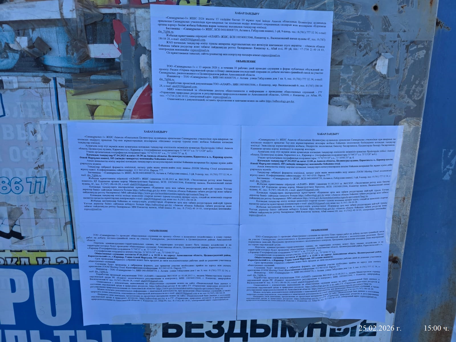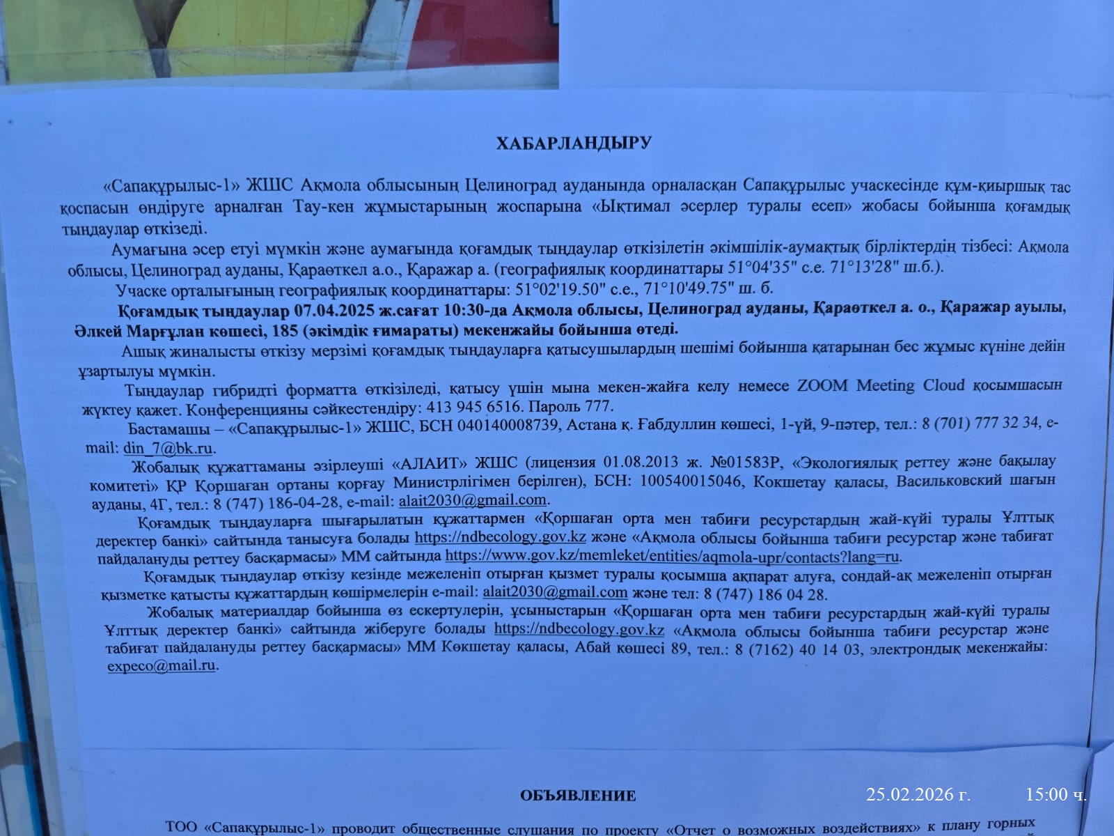 3. Общественные слушания организованны: Управление природных ресурсов и регулирования природопользования Акмолинской области, expeco@mail.ru,