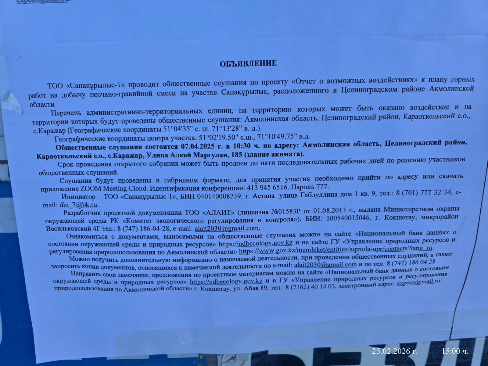 4. Повестка дня общественных слушаний: План горных работ на добычу песчано-гравийной смеси на месторождении «Сапакурылыс» расположенного на территории Целиноградского района Акмолинской области выполнен по заданию на проектирование ТОО Сапакурылыс-1 Геологоразведочные работы выполнены ТОО «АЛАИТ» в 2024 году по договору и за счет средств ТОО Сапакурылыс-1. Площадь месторождения составляет: Сапакурылыс – 69,3 га. В результате выполненных геологоразведочных работ было разведано и выявлено месторождение песчано-гравийной смеси Сапакурылыс. Административно участок распространения песчано-гравийной смеси Сапақұрылыс расположен в Целиноградском районе Акмолинской области Республики Казахстана, лист М-42-XII. Ближайшие населенные пункты: - село Каражар, расположенное в 4,3км северо-восточнее участка; - село Караоткель, расположенное в 6,6км северо-восточнее участка; - село Тайтобе, расположенное в 8,6км юго-восточнее участка; - село Акмол, расположенное в 12,9км северо-западнее участка; - город Астана, расположенный в 14,0км северо-восточнее участка. Ближайший водный объект – река Кишкене Мукыр, расположенная в 0,12км западнее участка. Режим работы на карьерах предусматривается круглогодичный (360 рабочих дней), в одну смену, продолжительностью 8 часов. Предусматривается следующий порядок ведения горных работ на карьере: 1. Для осуществления последующих рекультивационных работ почвенно-растительный слой будет складироваться во временные отвалы (бурты). 2. Выемка и складирование вскрышных пород. 3. Выемка и погрузка полезного ископаемого в забоях. 4. Транспортировка полезного ископаемого потребителю. Месторождения предусматривается отрабатывать одним уступом, с высотой от 7,4 до 11,6м. Средняя мощность продуктивной толщи составляет: 9,5 м. Учитывая небольшие размеры и мощности карьера, на добычном уступе планируется в работе по одному добычному блоку. Отработка полезного ископаемого будет производиться экскаватором Hyundai R300LC-9S LR. Планом предусматривается валовая выемка полезного ископаемого. Забой находится ниже уровня стояния экскаватора. Выемка грунтов производится боковыми проходками. Глубина копания экскаватора Hyundai R300LC-9S LR – 6,9 м. Доставка полезного ископаемого осуществляется автосамосвалами марки Shacman. Для снятия ПРС и для зачистки рабочих площадок, планировки подъездов в карьере, подгребанию полезного ископаемого к экскаватору предусмотрен бульдозер Shantui SD16.