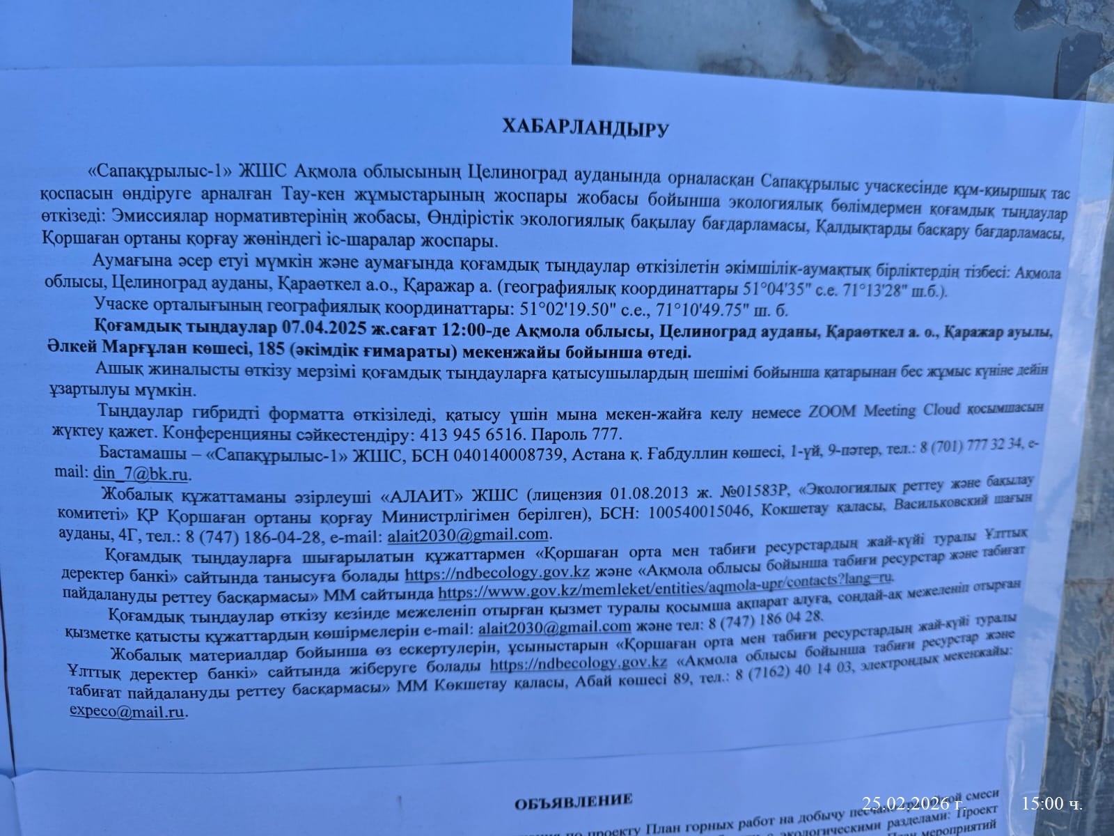 3. Общественные слушания организованны: Управление природных ресурсов и регулирования природопользования Акмолинской области, expeco@mail.ru,