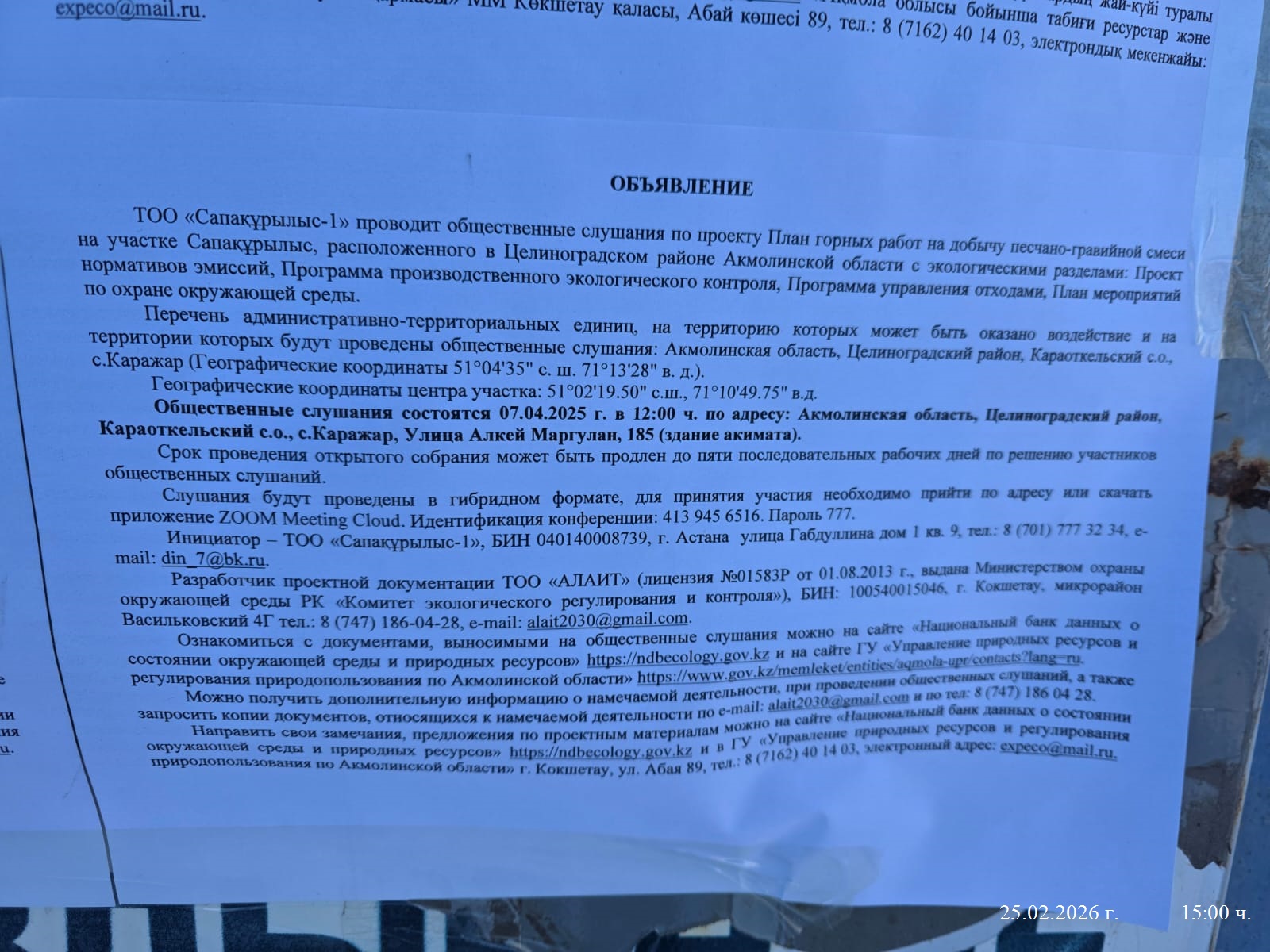 4. Повестка дня общественных слушаний: План горных работ на добычу песчано-гравийной смеси на месторождении «Сапакурылыс» расположенного на территории Целиноградского района Акмолинской области выполнен по заданию на проектирование ТОО Сапакурылыс-1 Геологоразведочные работы выполнены ТОО «АЛАИТ» в 2024 году по договору и за счет средств ТОО Сапакурылыс-1. Площадь месторождения составляет: Сапакурылыс – 69,3 га. В результате выполненных геологоразведочных работ было разведано и выявлено месторождение песчано-гравийной смеси Сапакурылыс. Административно участок распространения песчано-гравийной смеси Сапақұрылыс расположен в Целиноградском районе Акмолинской области Республики Казахстана, лист М-42-XII. Ближайшие населенные пункты: - село Каражар, расположенное в 4,3км северо-восточнее участка; - село Караоткель, расположенное в 6,6км северо-восточнее участка; - село Тайтобе, расположенное в 8,6км юго-восточнее участка; - село Акмол, расположенное в 12,9км северо-западнее участка; - город Астана, расположенный в 14,0км северо-восточнее участка. Ближайший водный объект – река Кишкене Мукыр, расположенная в 0,12км западнее участка. Режим работы на карьерах предусматривается круглогодичный (360 рабочих дней), в одну смену, продолжительностью 8 часов. Предусматривается следующий порядок ведения горных работ на карьере: 1. Для осуществления последующих рекультивационных работ почвенно-растительный слой будет складироваться во временные отвалы (бурты). 2. Выемка и складирование вскрышных пород. 3. Выемка и погрузка полезного ископаемого в забоях. 4. Транспортировка полезного ископаемого потребителю. Месторождения предусматривается отрабатывать одним уступом, с высотой от 7,4 до 11,6м. Средняя мощность продуктивной толщи составляет: 9,5 м. Учитывая небольшие размеры и мощности карьера, на добычном уступе планируется в работе по одному добычному блоку. Отработка полезного ископаемого будет производиться экскаватором Hyundai R300LC-9S LR. Планом предусматривается валовая выемка полезного ископаемого. Забой находится ниже уровня стояния экскаватора. Выемка грунтов производится боковыми проходками. Глубина копания экскаватора Hyundai R300LC-9S LR – 6,9 м. Доставка полезного ископаемого осуществляется автосамосвалами марки Shacman. Для снятия ПРС и для зачистки рабочих площадок, планировки подъездов в карьере, подгребанию полезного ископаемого к экскаватору предусмотрен бульдозер Shantui SD16.