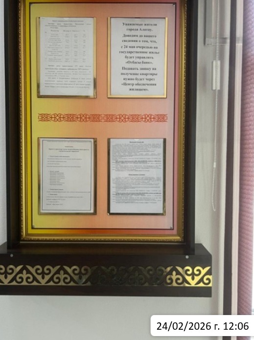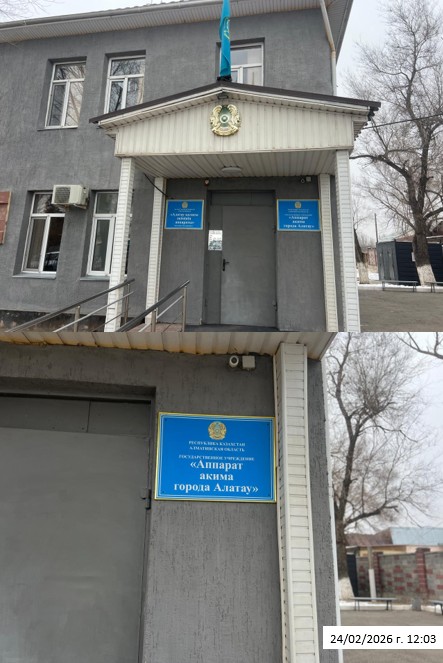 6.3. расположение мест, специально предназначенных для Размещения печатных объявлений (доски объявлений): ул. Ж. Кудайбергенова 2, ГУ Аппарат акима города Алатау, доска объявлений