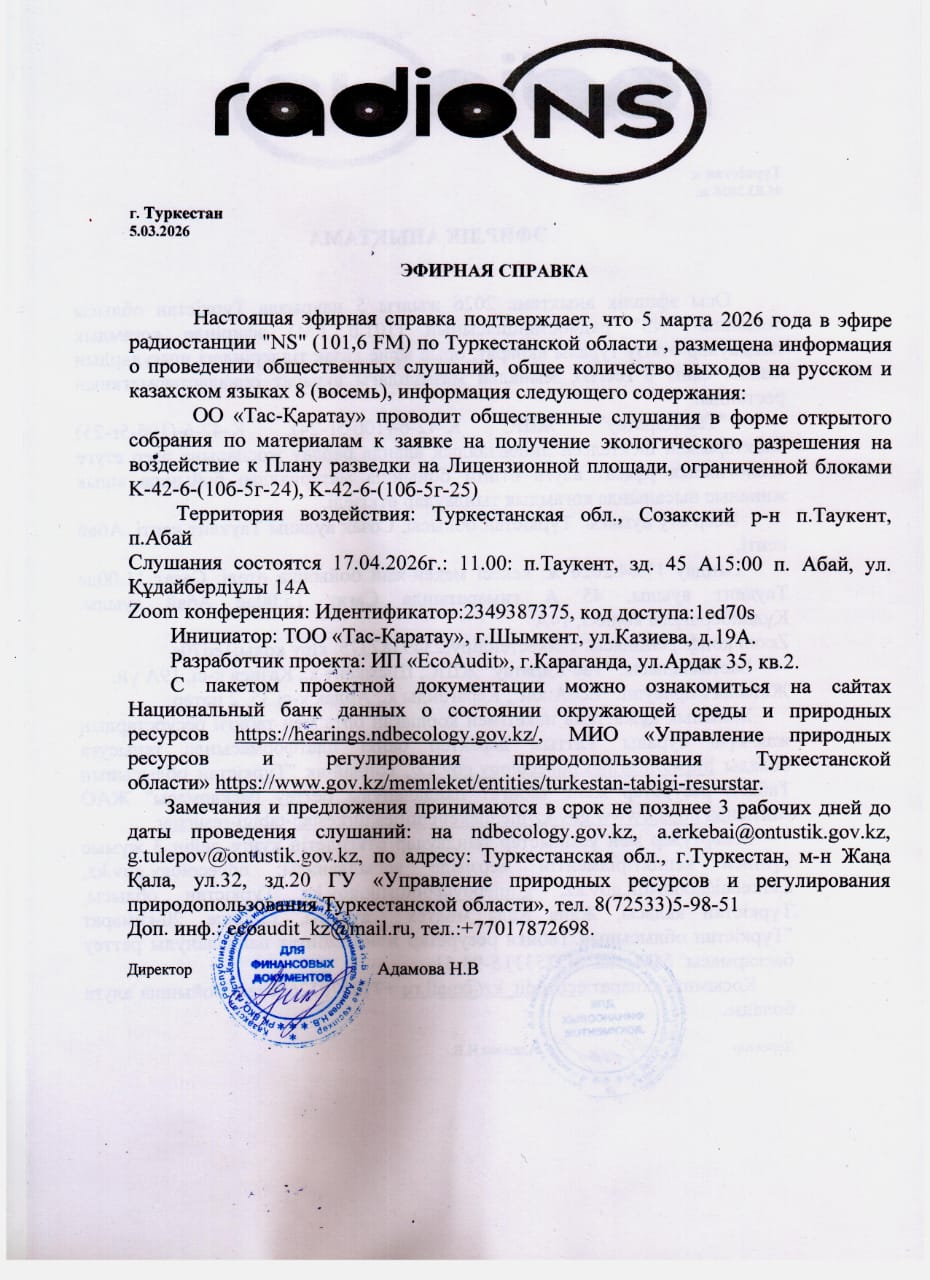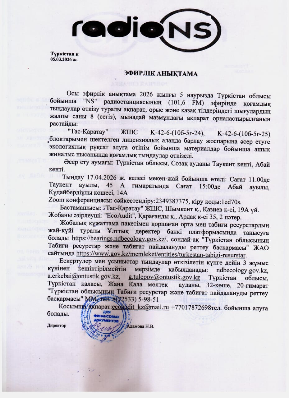 3. Общественные слушания организованны: Управление природных ресурсов и регулирования природопользования Туркестанской области, a.erkebai@ontustik.gov.kz,