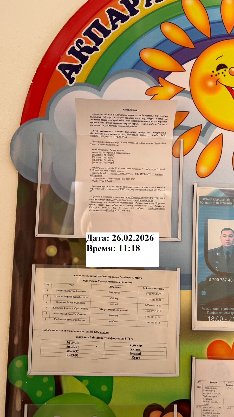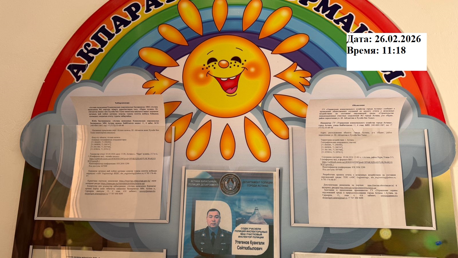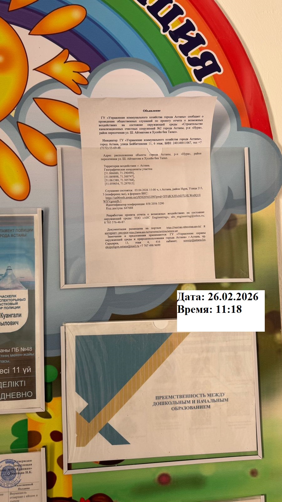 6.3. расположение мест, специально предназначенных для Размещения печатных объявлений (доски объявлений): доска объявлений акимата, школы, садик г.Астана