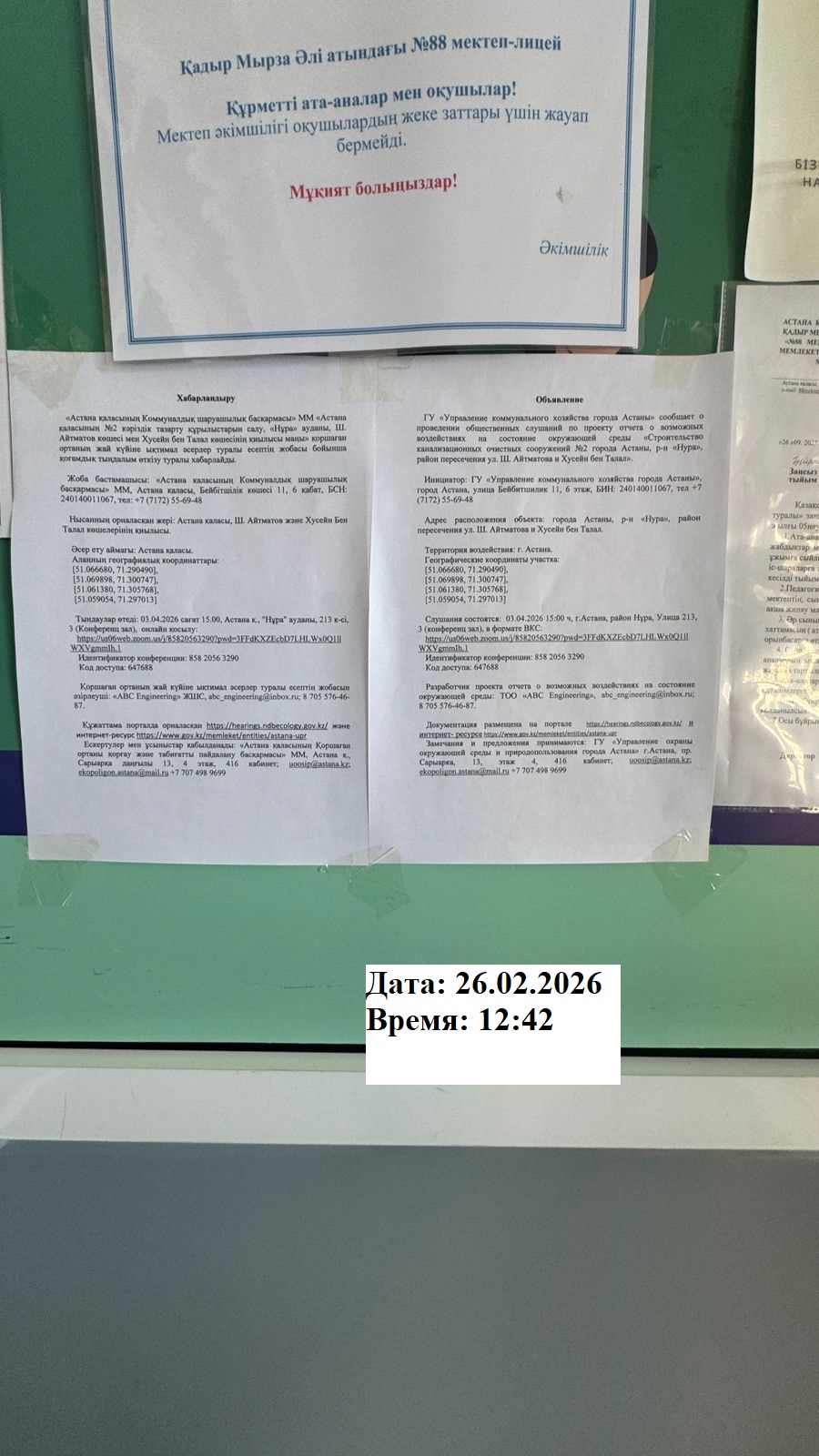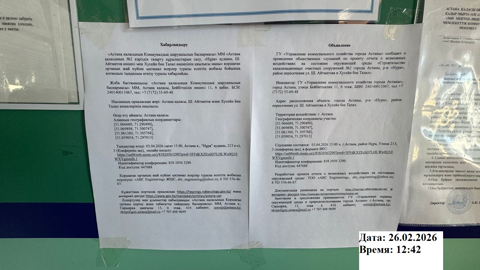 3. Общественные слушания организованны: Акимат Нур-Султана, uoosip@astana.kz,