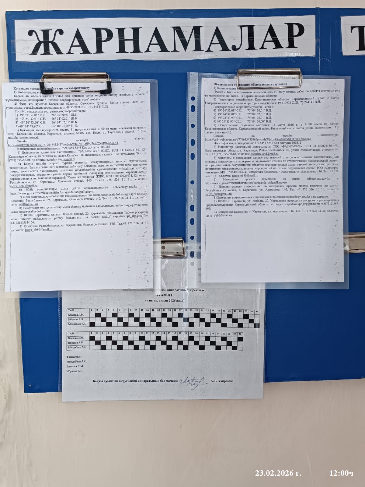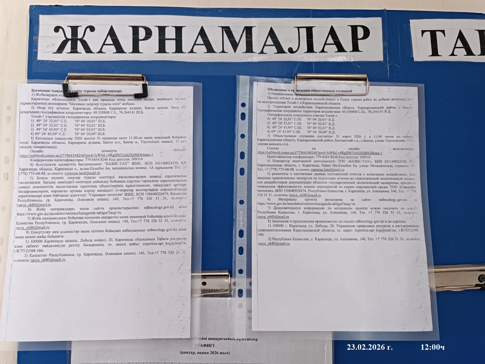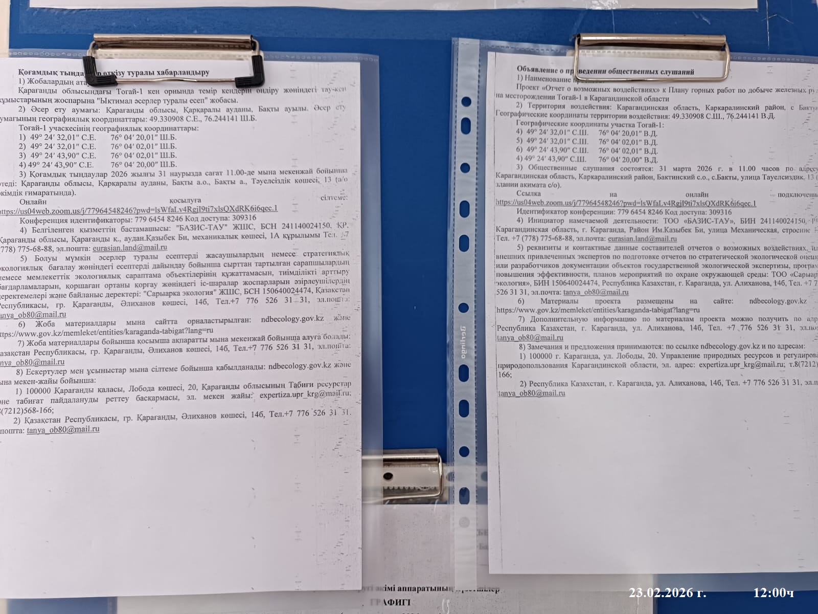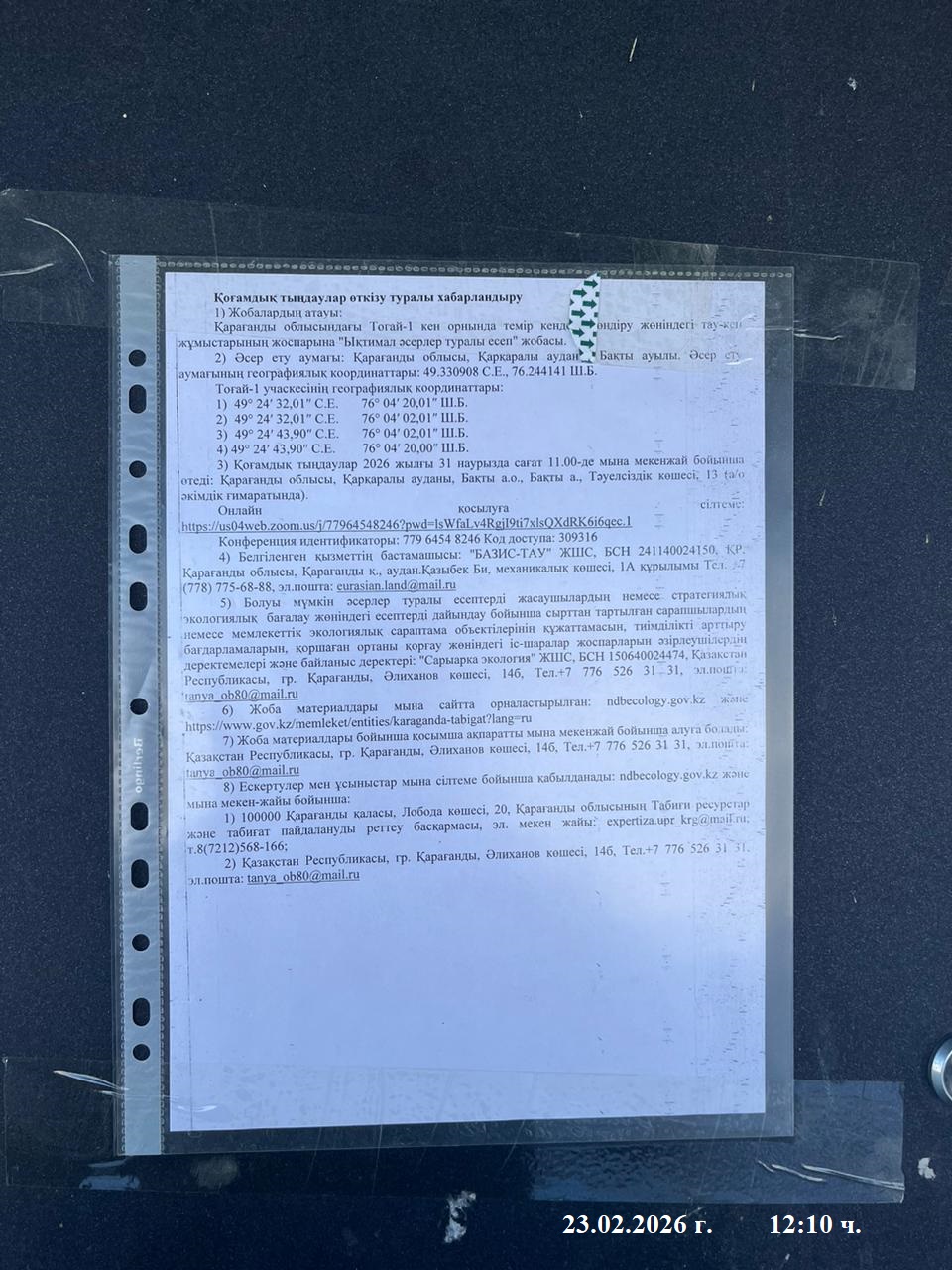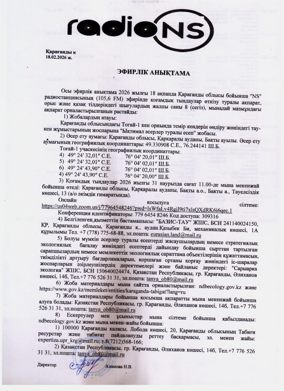 3. Общественные слушания организованны: Управление природных ресурсов и регулирования природопользования Карагандинской области, expertiza.upr_krg@mail.ru,