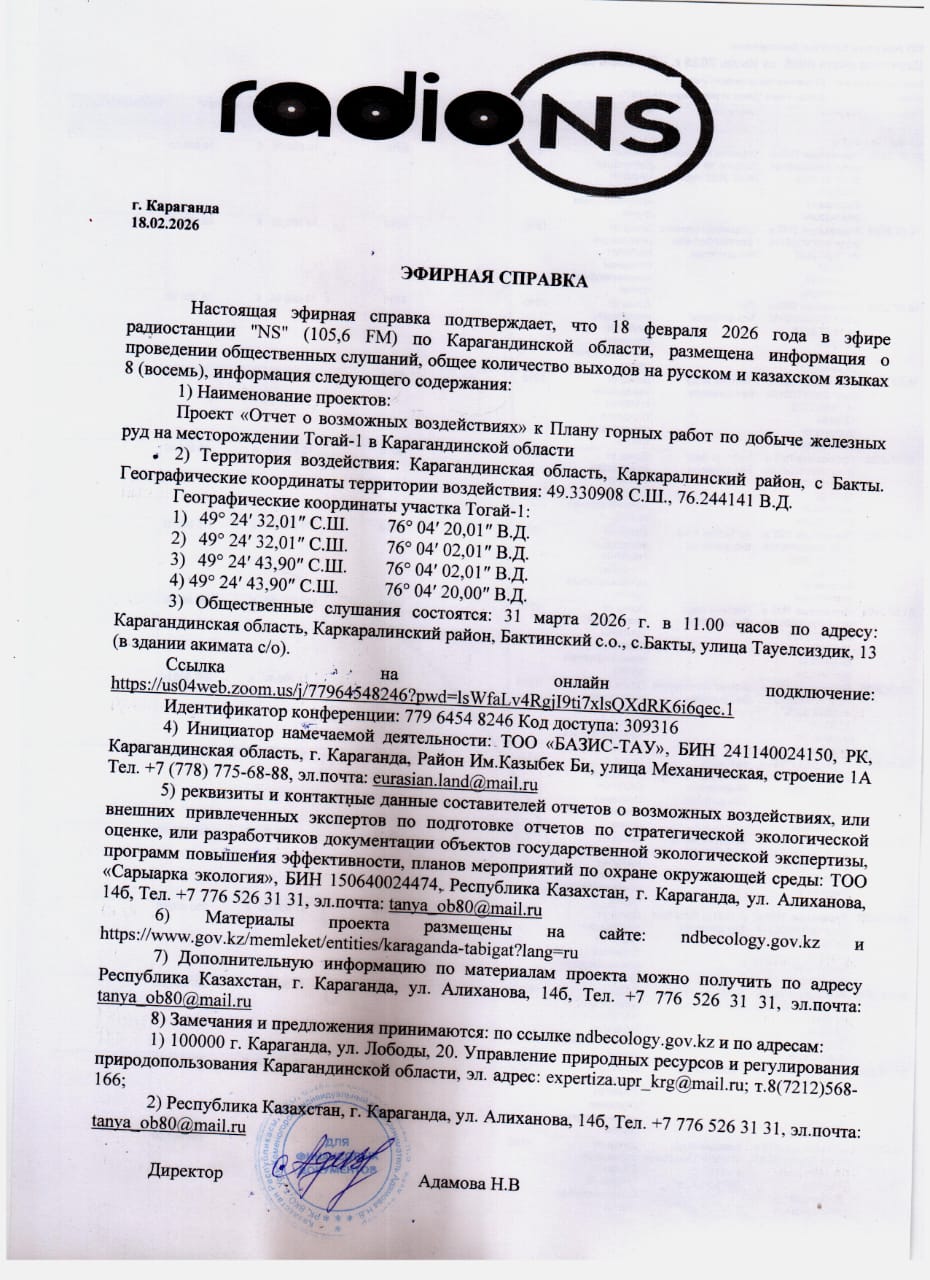 По проекту: Проект «Отчет о возможных воздействиях» к Плану горных работ по добыче железных руд на месторождении Тогай-1 в Карагандинской области