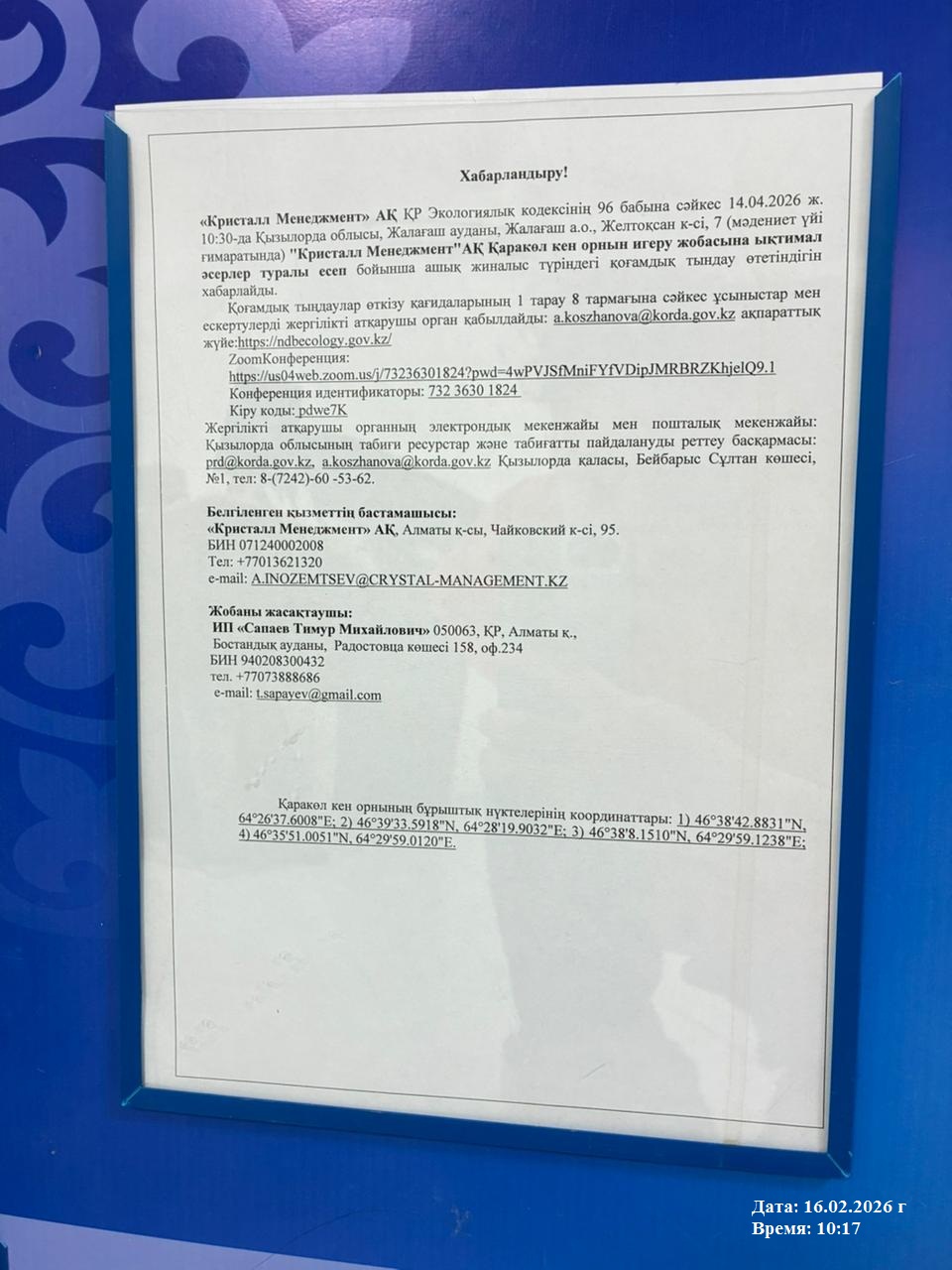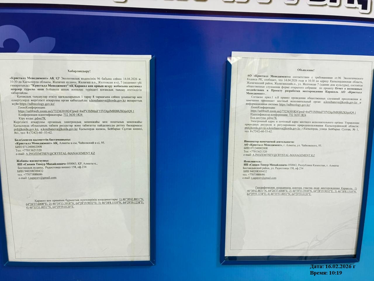 3. Общественные слушания организованны: Управление природных ресурсов и регулирования природопользования Кызылординской области, prd@korda.gov.kz 87242605362, 605369,