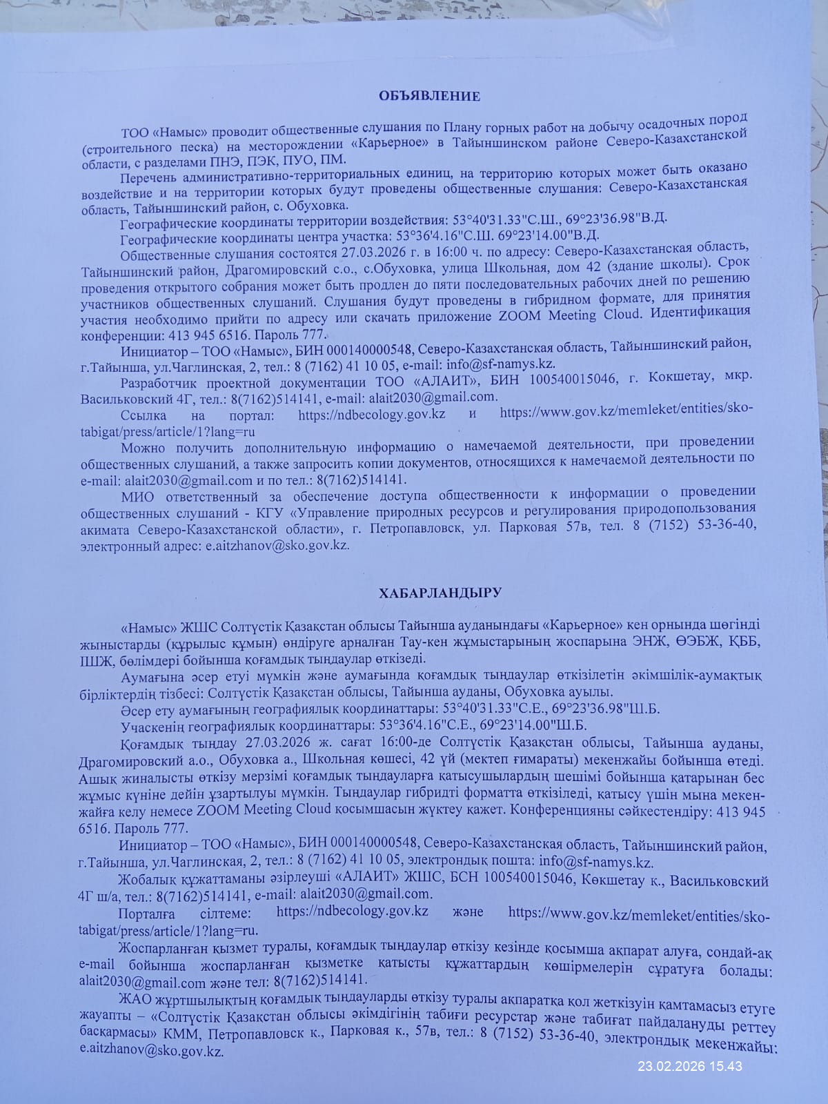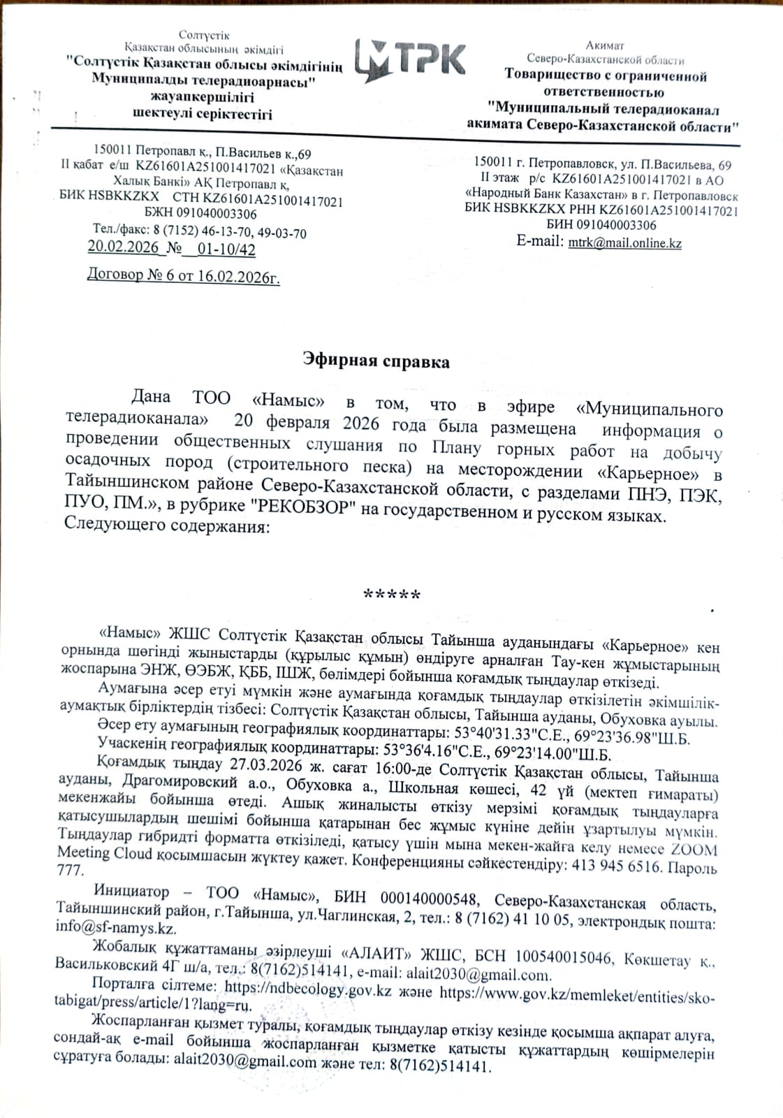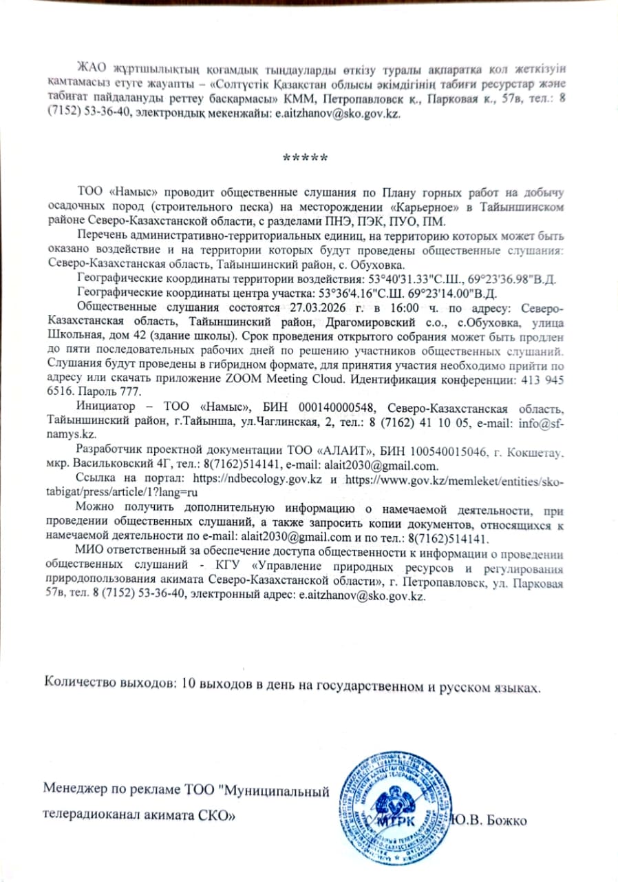 3. Общественные слушания организованны: Управление природных ресурсов и регулирования природопользования Северо-Казахстанской области, e.aitzhanov@sko.gov.kz,