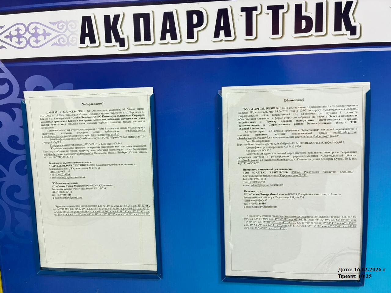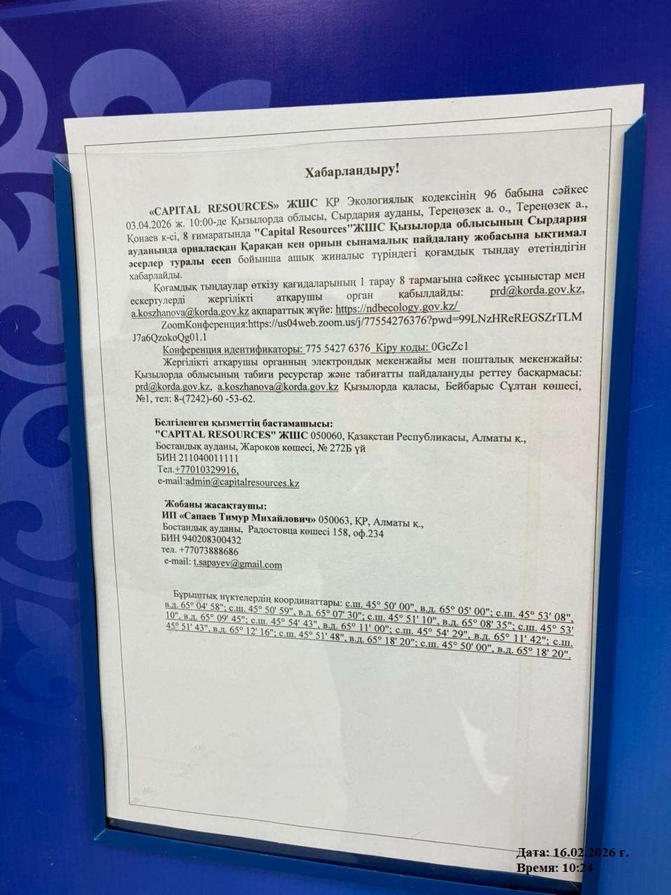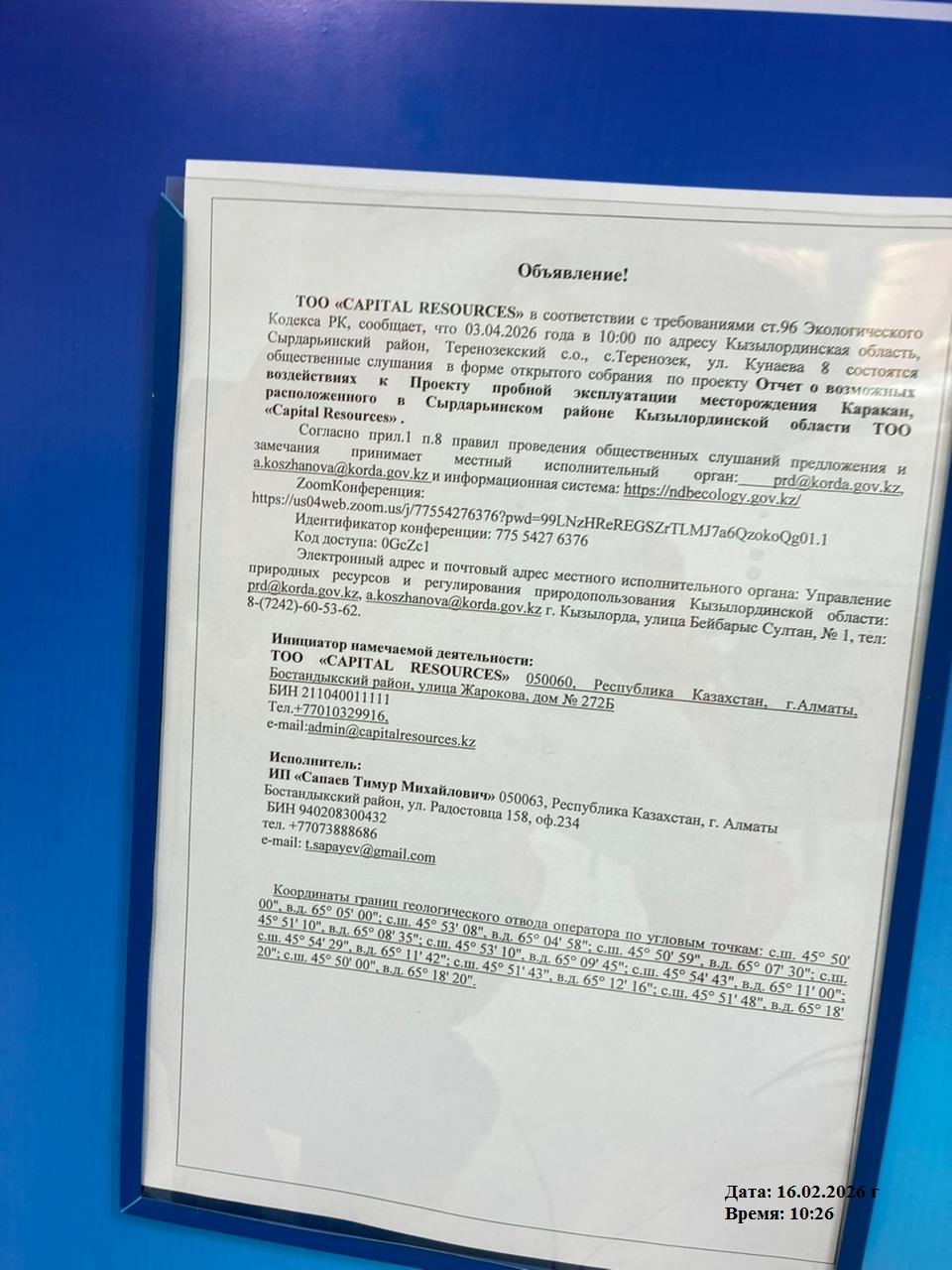 3. Общественные слушания организованны: Управление природных ресурсов и регулирования природопользования Кызылординской области, prd@korda.gov.kz 87242605362, 605369,