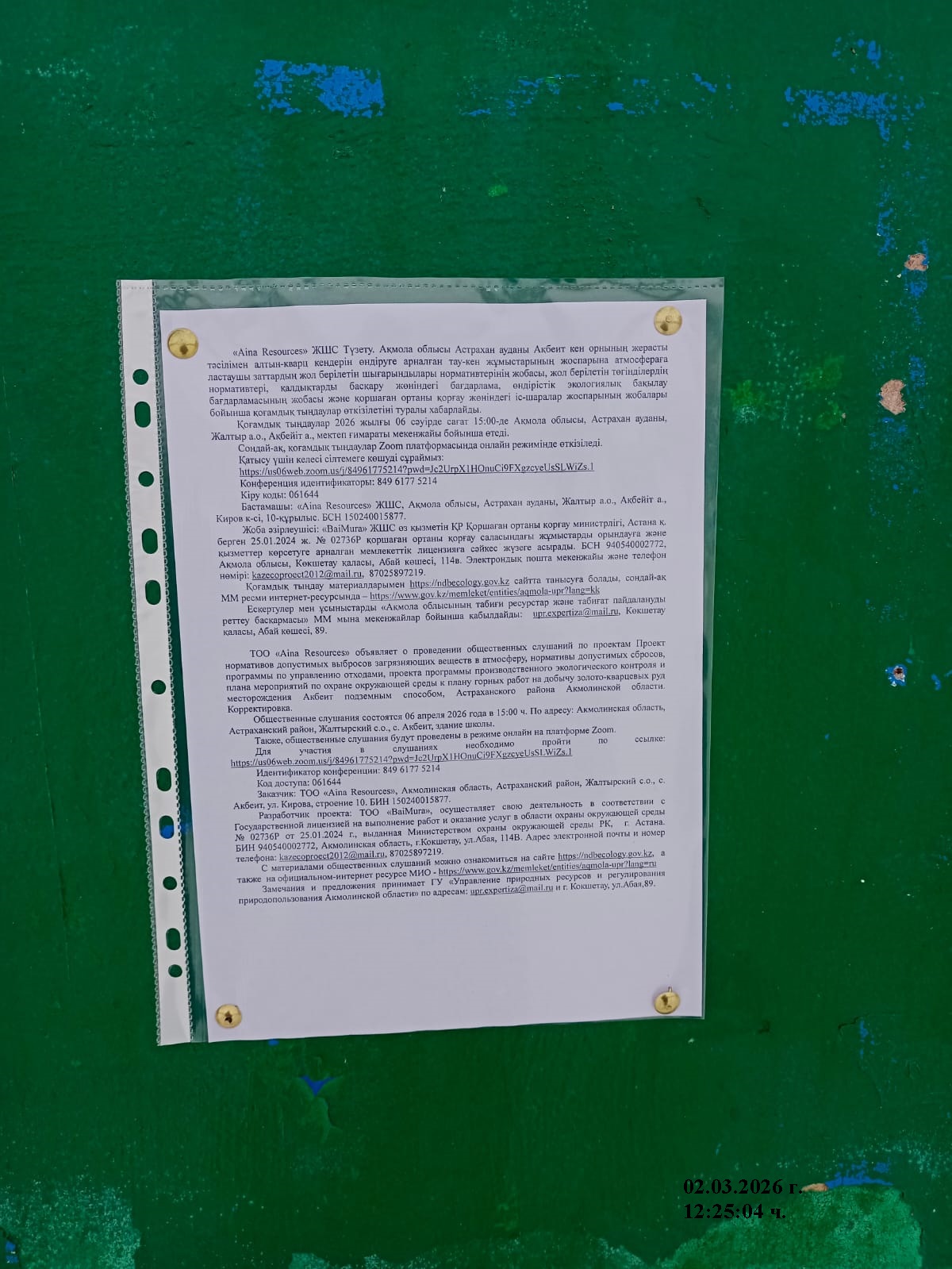 3. Общественные слушания организованны: Управление природных ресурсов и регулирования природопользования Акмолинской области, expeco@mail.ru,