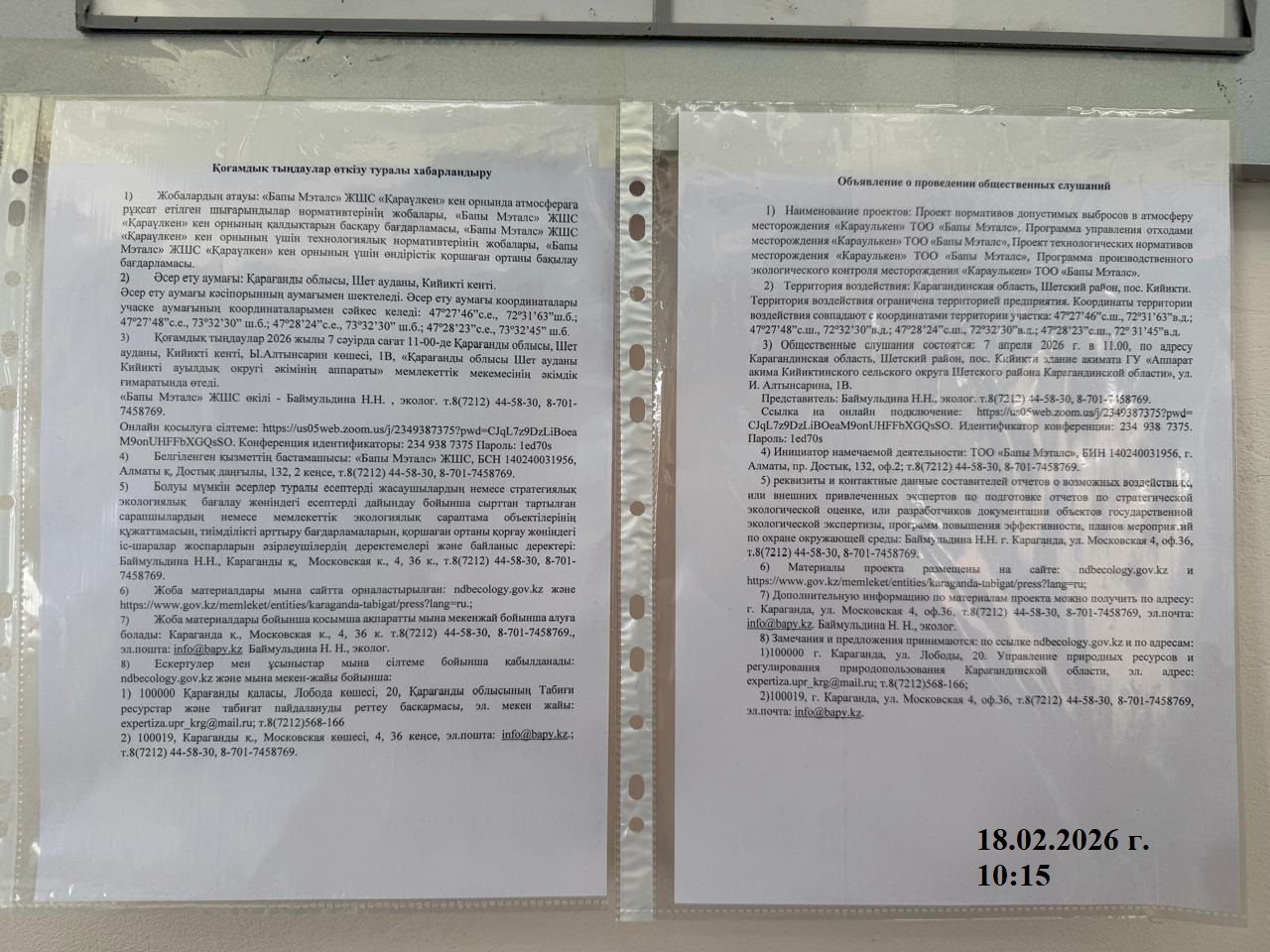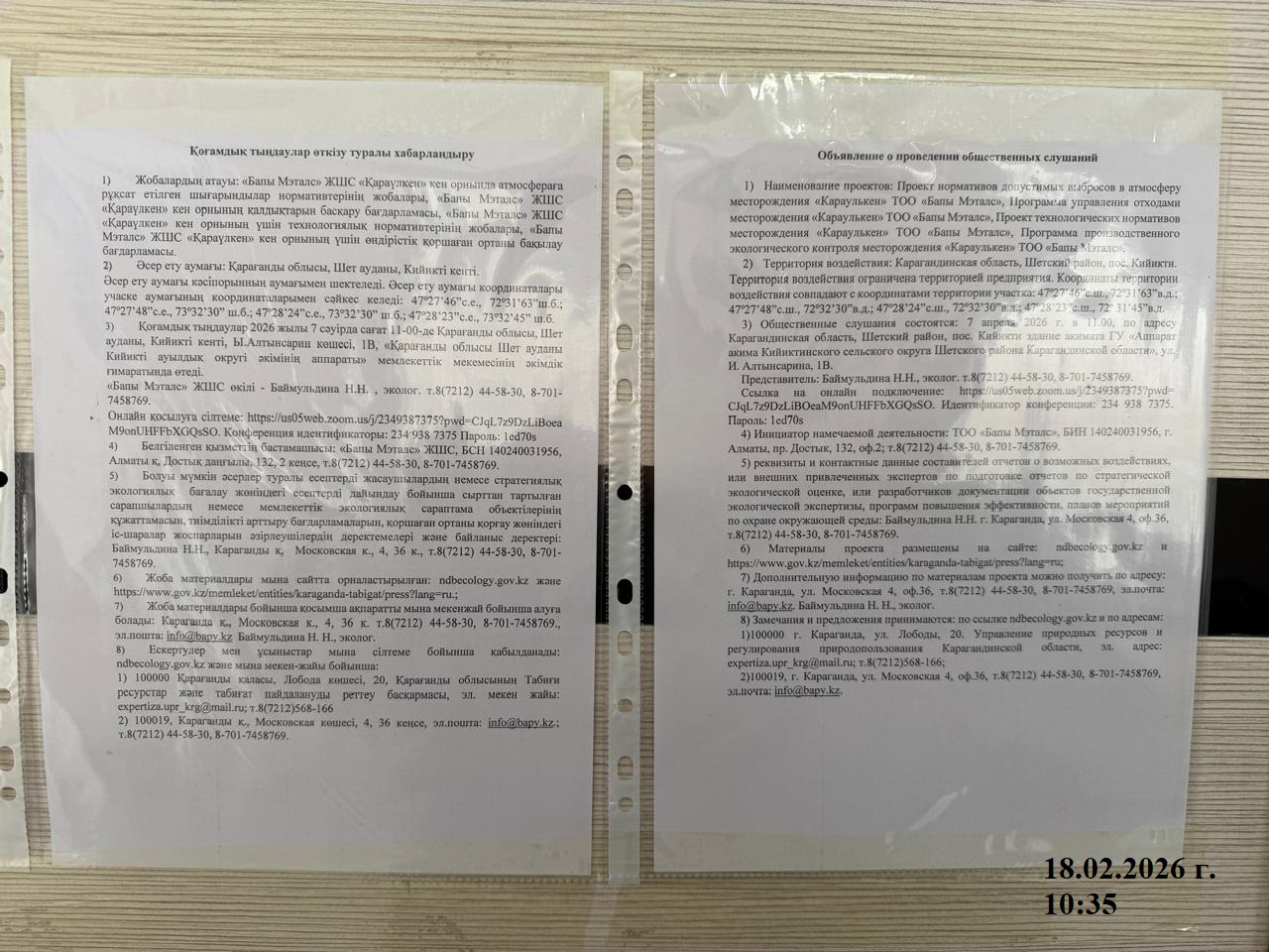 3. Общественные слушания организованны: Управление природных ресурсов и регулирования природопользования Карагандинской области, expertiza.upr_krg@mail.ru,