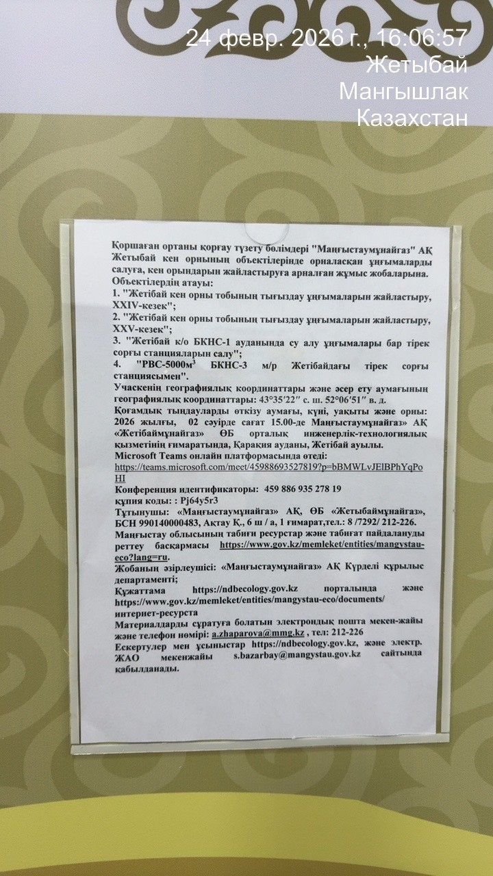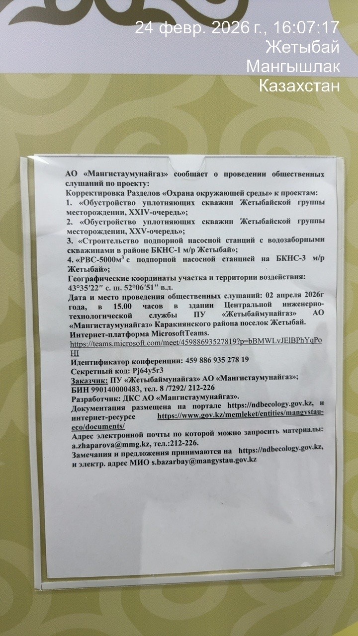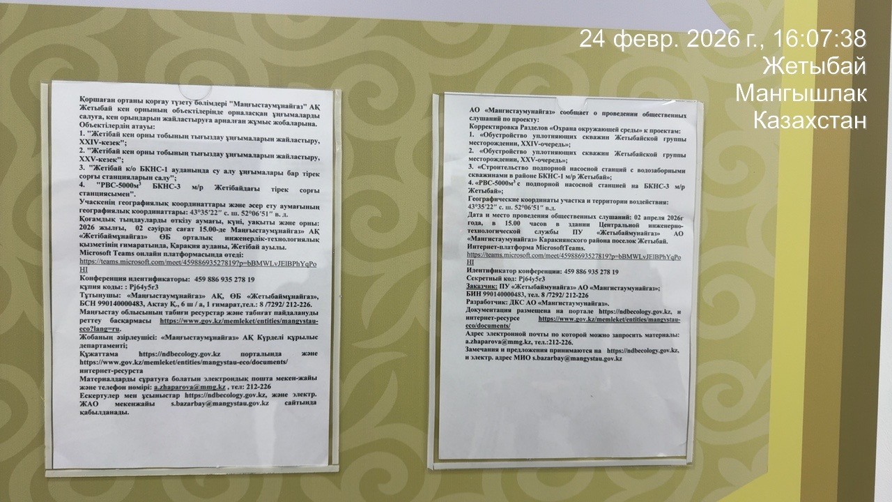 3. Общественные слушания организованны: Управление природных ресурсов и регулирования природопользования Мангистауской области, s.bazarbay@mangystau.gov.kz,