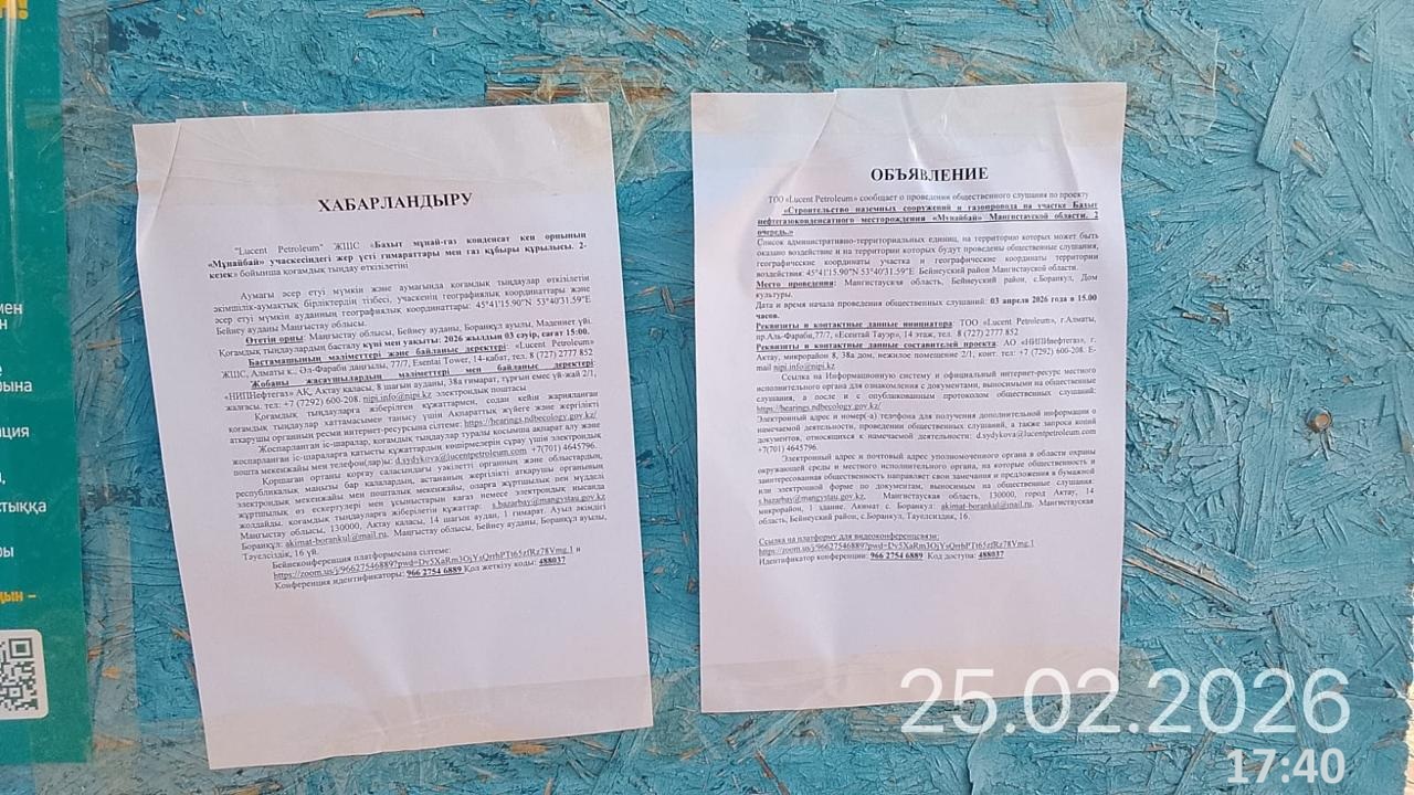 3. Общественные слушания организованны: Управление природных ресурсов и регулирования природопользования Мангистауской области, s.bazarbay@mangystau.gov.kz,