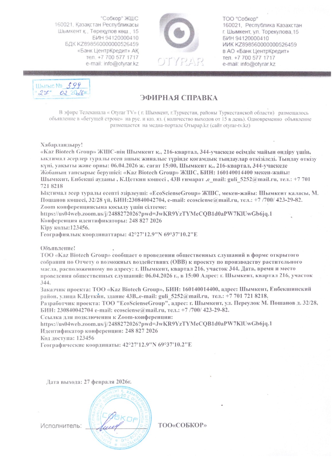 6.2. Наименование теле или радиоканала, где будет размещено объявление: Телерадиокомпания "Otyrar"