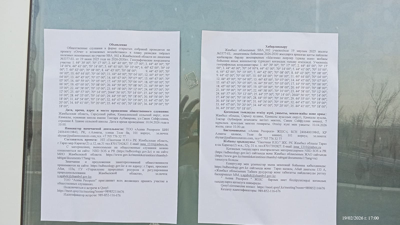 3. Общественные слушания организованны: Управление природных ресурсов и регулирования природопользования Жамбылской области, s.agabek@zhambyl.gov.kz,