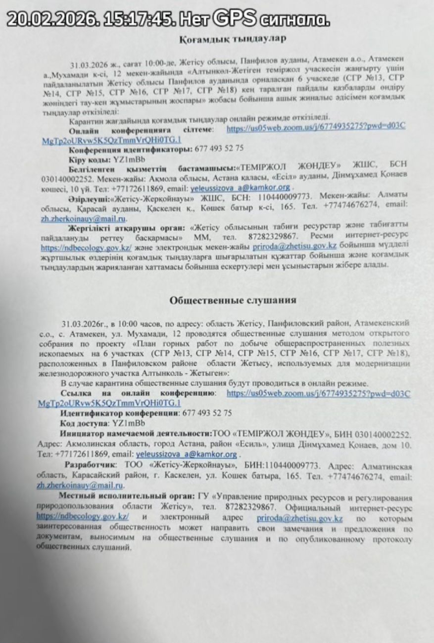 4. Повестка дня общественных слушаний: «Алтынкөл-Жетіген теміржол учаскесін жаңғырту үшін пайдаланылатын Жетісу облысы Панфилов ауданында орналасқан 6 учаскеде (СГР №13, СГР №14, СГР №15, СГР №16, СГР №17, СГР №18) кең таралған пайдалы қазбаларды өндіру жөніндегі тау-кен жұмыстарының жоспары» жобасы бойынша ашық жиналыс әдісімен қоғамдық тыңдаулар өткізіледі: 1) 31.03.2026 ж., сағат 10:00-де, Жетісу облысы, Панфилов ауданы, Атамекен а.о., Атамекен а.,Мухамади к-сі, 12 мекен-жайында; 2) 31.03.2026 ж., сағат 15:00-де Жетісу облысы, Панфилов ауданы, ҮлкенШыған а.о., Үлкен Шыған а., Жібек Жолы к-сі, 61 мекен-жайындағы Мәдениет Үйі ғимаратында. Карантин жағдайында қоғамдық тыңдаулар онлайн режимде өткізіледі. Онлайн конференцияға сілтеме: https://us05web.zoom.us/j/6774935275?pwd=d03C MgTp2oURvw5K5QzTmmVrQHi0TG.1 Конференция идентификаторы: 677 493 52 75 Кіру коды: YZ1mBb Белгіленген қызметтің бастамашысы:«ТЕМІРЖОЛ ЖӨНДЕУ» ЖШС, БСН 030140002252. Мекен-жайы: Ақмола облысы, Астана қаласы, «Есіл» ауданы, Дінмұхамед Қонаев көшесі, 10 үй. Тел: +77172611869, email: yeleussizova_a@kamkor.org . Әзірлеуші:«Жетісу-Жерқойнауы» ЖШС, БСН: 110440009773. Мекен-жайы: Алматы облысы, Қарасай ауданы, Қаскелең қ., Көшек батыр к-сі, 165. Тел. +77474676274, email: zh.zherkoinauy@mail.ru. Жергілікті атқарушы орган: «Жетісу облысының табиғи ресурстар және табиғатты пайдалануды реттеу басқармасы» ММ, тел. 87282329867. Ресми интернет-ресурс https://ndbecology.gov.kz/ және электрондық мекен-жайы priroda@zhetisu.gov.kz бойынша мүдделі жұртшылық өздерінің қоғамдық тыңдауларға шығарылатын құжаттар бойынша және қоғамдық тыңдаулардың жарияланған хаттамасы бойынша ескертулері мен ұсыныстарын жібере алады. Проводятся общественные слушания методом открытого собрания по проекту «План горных работ по добыче общераспространенных полезных ископаемых на 6 участках (СГР №13, СГР №14, СГР №15, СГР №16, СГР №17, СГР №18), расположенных в Панфиловском районе области Жетысу, используемых для модернизации железнодорожного участка Алтынколь - Жетыген»: 1) 31.03.2026г., в 10:00 часов, по адресу: область Жетісу, Панфиловский район, Атамекенский с.о., с. Атамекен, ул. Мухамади, 12. 2) 31.03.2026г., в 15:00 часов, по адресу: область Жетісу, Панфиловский район, Улькеншыганский с.о., с. Улкен Шыган, Дом Культуры по адресу: ул. Жибек Жолы, 61. В случае карантина общественные слушания будут проводиться в онлайн режиме. Ссылка на онлайн конференцию: https://us05web.zoom.us/j/6774935275?pwd=d03C MgTp2oURvw5K5QzTmmVrQHi0TG.1 Идентификатор конференции: 677 493 52 75 Код доступа: YZ1mBb Инициатор намечаемой деятельности:ТОО «ТЕМІРЖОЛ ЖӨНДЕУ», БИН 030140002252. Адрес: Акмолинская область, город Астана, район «Есиль», улица Дінмұхамед Қонаев, дом 10. Тел: +77172611869, email: yeleussizova_a@kamkor.org . Разработчик: ТОО «Жетісу-Жерқойнауы», БИН:110440009773. Адрес: Алматинская область, Карасайский район, г. Каскелен, ул. Кошек батыра, 165. Тел. +77474676274, email: zh.zherkoinauy@mail.ru. Местный исполнительный орган: ГУ «Управление природных ресурсов и регулирования природопользования области Жетісу», тел. 87282329867. Официальный интернет-ресурс https://ndbecology.gov.kz/ и электронный адрес priroda@zhetisu.gov.kz по которым заинтересованная общественность может направить свои замечания и предложения по документам, выносимым на общественные слушания и по опубликованному протоколу общественных слушаний.