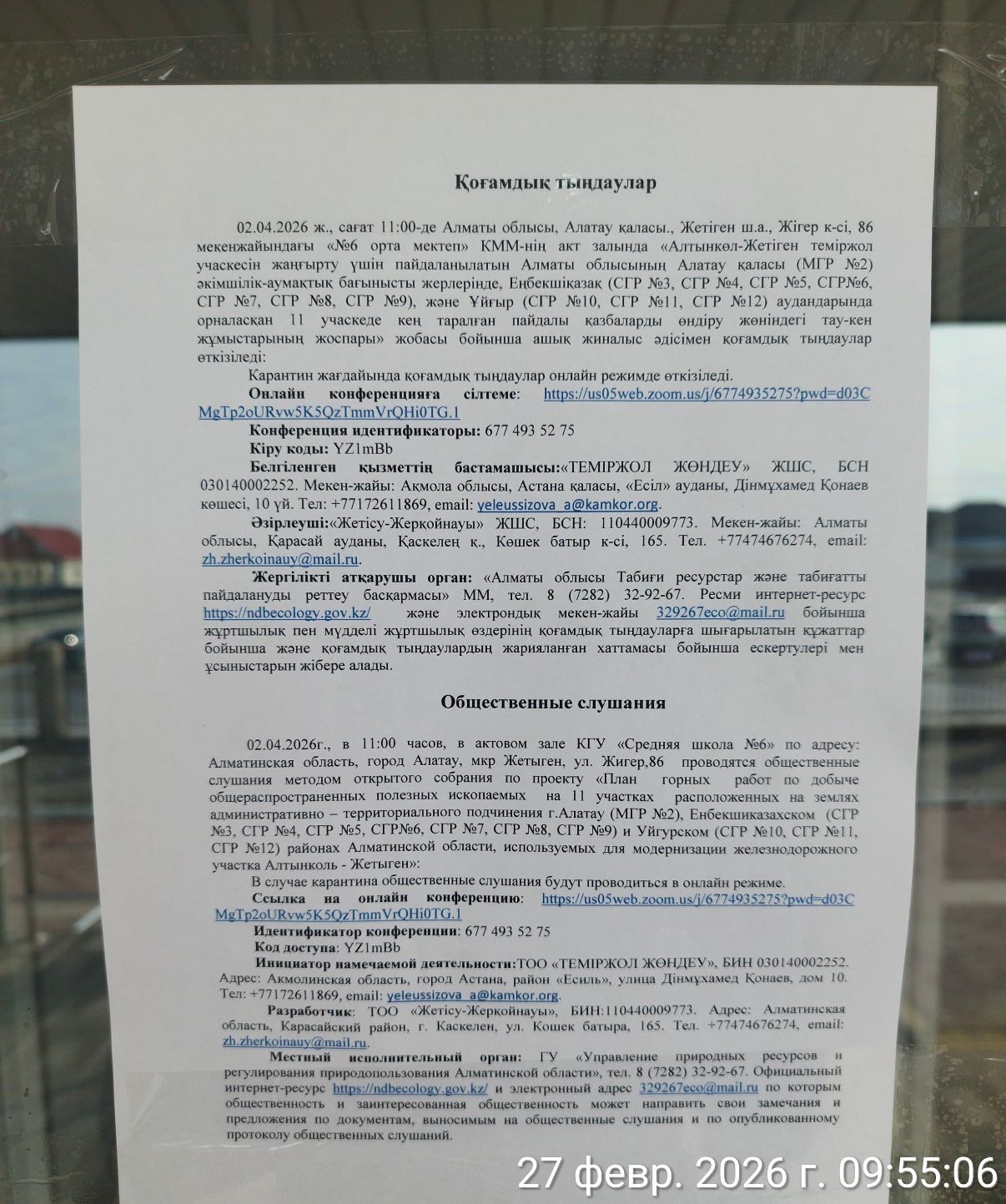 4. Повестка дня общественных слушаний: «Алтынкөл-Жетіген теміржол учаскесін жаңғырту үшін пайдаланылатын Алатау қаласы (МГР №2) әкімшілік-аумақтық бағынысты жерлерінде, Еңбекшіқазақ (СГР №3, СГР №4, СГР №5, СГР№6, СГР №7, СГР №8, СГР №9), және Ұйғыр (СГР №10, СГР №11, СГР №12) аудандарында орналасқан 11 учаскеде кең таралған пайдалы қазбаларды өндіру жөніндегі тау-кен жұмыстарының жоспары» жобасы бойынша ашық жиналыс әдісімен қоғамдық тыңдаулар өткізіледі: 1) 01.04.2026 ж., сағат 11:00-де Алматы облысы, Еңбекшіқазақ ауданы, Қаражота а.о., Сарыбұлақ а., Қонаев к-сі, 8 мекен-жайындағы Мәдениет Үйі ғимаратында. 2) 01.04.2026 ж., сағат 15:00-де, Алматы облысы, Ұйғыр ауданы, Қырғызсай а.о., Рахат а., Жерұйық к-сі, 1 мекенжайындағы «Рахат орта мектебі мектеп жасына дейінгі шағын орталығы бар» КММ-нің акт залында; 3) 02.04.2026 ж., сағат 11:00-де Алматы облысы, Алатау қаласы., Жетіген ш.а., Жігер к-сі, 86 мекенжайындағы «№6 орта мектеп» КММ-нің акт залында. Карантин жағдайында қоғамдық тыңдаулар онлайн режимде өткізіледі. Онлайн конференцияға сілтеме: https://us05web.zoom.us/j/6774935275?pwd=d03C MgTp2oURvw5K5QzTmmVrQHi0TG.1 Конференция идентификаторы: 677 493 52 75 Кіру коды: YZ1mBb Белгіленген қызметтің бастамашысы:«ТЕМІРЖОЛ ЖӨНДЕУ» ЖШС, БСН 030140002252. Мекен-жайы: Ақмола облысы, Астана қаласы, «Есіл» ауданы, Дінмұхамед Қонаев көшесі, 10 үй. Тел: +77172611869, email: yeleussizova_a@kamkor.org. Әзірлеуші:«Жетісу-Жерқойнауы» ЖШС, БСН: 110440009773. Мекен-жайы: Алматы облысы, Қарасай ауданы, Қаскелең қ., Көшек батыр к-сі, 165. Тел. +77474676274, email: zh.zherkoinauy@mail.ru. Жергілікті атқарушы орган: «Алматы облысы Табиғи ресурстар және табиғатты пайдалануды реттеу басқармасы» ММ, тел. 8 (7282) 32-92-67. Ресми интернет-ресурс https://ndbecology.gov.kz/ және электрондық мекен-жайы 329267eco@mail.ru бойынша жұртшылық пен мүдделі жұртшылық өздерінің қоғамдық тыңдауларға шығарылатын құжаттар бойынша және қоғамдық тыңдаулардың жарияланған хаттамасы бойынша ескертулері мен ұсыныстарын жібере алады. Проводятся общественные слушания методом открытого собрания по проекту «План горных работ по добыче общераспространенных полезных ископаемых на 11 участках расположенных на землях административно – территориального подчинения г.Алатау (МГР №2), Енбекшиказахском (СГР №3, СГР №4, СГР №5, СГР№6, СГР №7, СГР №8, СГР №9) и Уйгурском (СГР №10, СГР №11, СГР №12) районах Алматинской области, используемых для модернизации железнодорожного участка Алтынколь - Жетыген»: 1) 01.04.2026г., в 11:00 часов, по адресу: Алматинская область , Енбекшиказахский район, Каражотинский с.о., с. Сарыбулак, Дом Культуры по адресу: ул. Конаев, 8. 2) 01.04.2026г., в 15:00 часов, в актовом зале КГУ «Рахатская средняя школа с дошкольным миницентром» по адресу: Алматинская область, Уйгурский район, Кыргызсайский с.о., с. Рахат, ул. Жеруйык, 1. 3) 02.04.2026г., в 11:00 часов, в актовом зале КГУ «Средняя школа №6» по адресу: Алматинская область, город Алатау, мкр Жетыген, ул. Жигер,86. В случае карантина общественные слушания будут проводиться в онлайн режиме. Ссылка на онлайн конференцию: https://us05web.zoom.us/j/6774935275?pwd=d03C MgTp2oURvw5K5QzTmmVrQHi0TG.1 Идентификатор конференции: 677 493 52 75 Код доступа: YZ1mBb Инициатор намечаемой деятельности:ТОО «ТЕМІРЖОЛ ЖӨНДЕУ», БИН 030140002252. Адрес: Акмолинская область, город Астана, район «Есиль», улица Дінмұхамед Қонаев, дом 10. Тел: +77172611869, email: yeleussizova_a@kamkor.org. Разработчик: ТОО «Жетісу-Жерқойнауы», БИН:110440009773. Адрес: Алматинская область, Карасайский район, г. Каскелен, ул. Кошек батыр