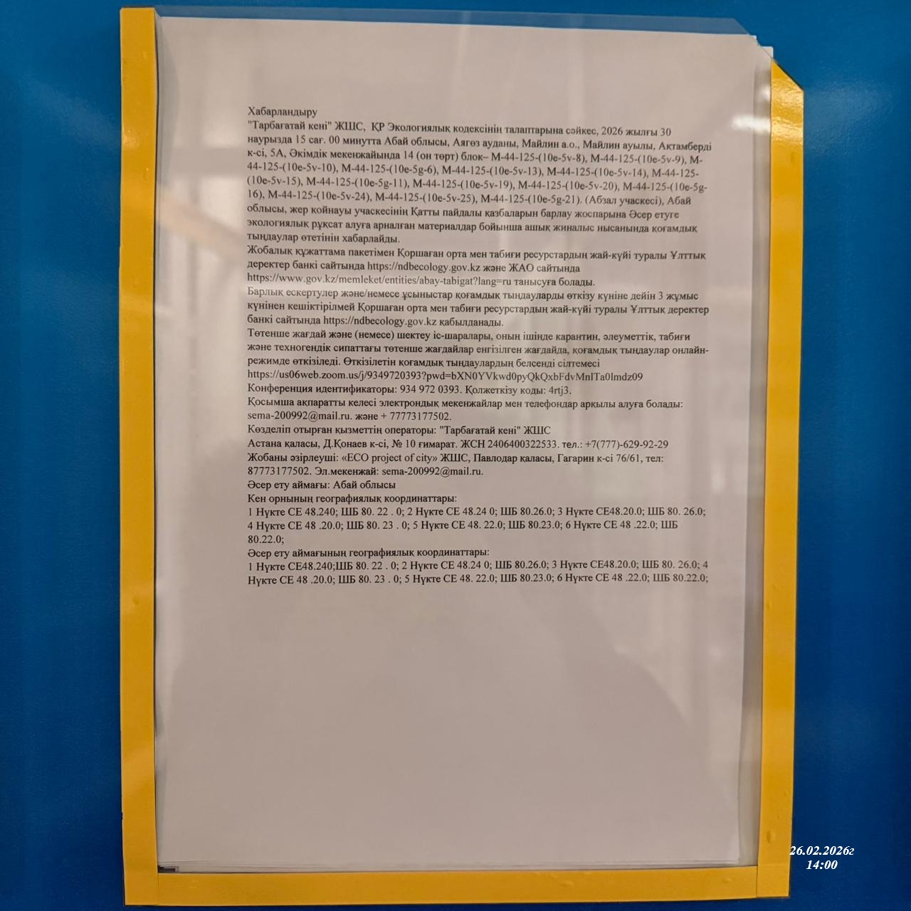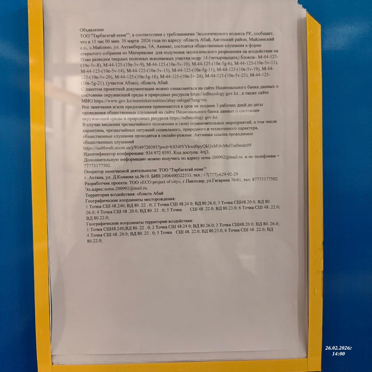 3. Общественные слушания организованны: Главный специалист УПР и ПР область Абай, prirodnyye_resursy_obl.abay@mail.ru,