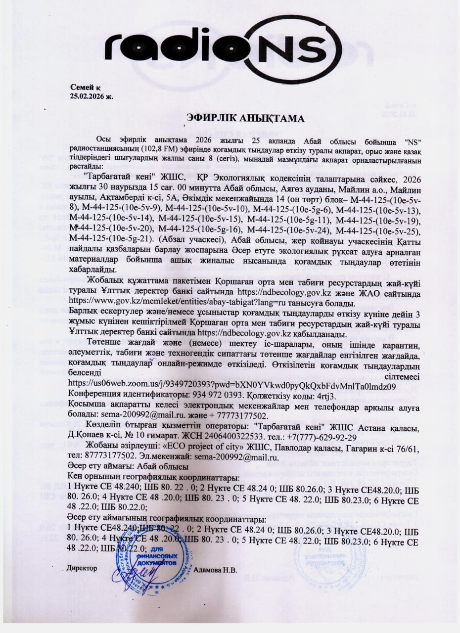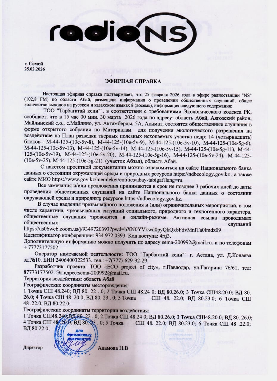 4. Повестка дня общественных слушаний: на План разведки твердых полезных ископаемых участка недр: 14 (четырнадцать) блоков– М-44-125-(10е-5v-8), М-44-125-(10е-5v-9), М-44-125-(10е-5v-10), М-44-125-(10е-5g-6), М-44-125-(10е-5v-13), М-44-125-(10е-5v-14), М-44-125-(10е-5v-15), М-44-125-(10е-5g-11), М-44-125-(10е-5v-19), М-44-125-(10е-5v-20), М-44-125-(10е-5g-16), М-44-125-(10е-5v-24), М-44-125-(10е-5v-25), М-44-125-(10е-5g-21). (участок Абзал), область Абай. В случае введения чрезвычайного положения и (или) ограничительных мероприятий, в том числе карантина, чрезвычайных ситуаций социального, природного и техногенного характера, общественные слушания проводятся в онлайн-режиме. Активная ссылка проводимых общественных слушаний https://us06web.zoom.us/j/9349720393?pwd=bXN0YVkwd0pyQkQxbFdvMnlTa0lmdz09 Идентификатор конференции: 934 972 0393. Код доступа: 4rtj3.