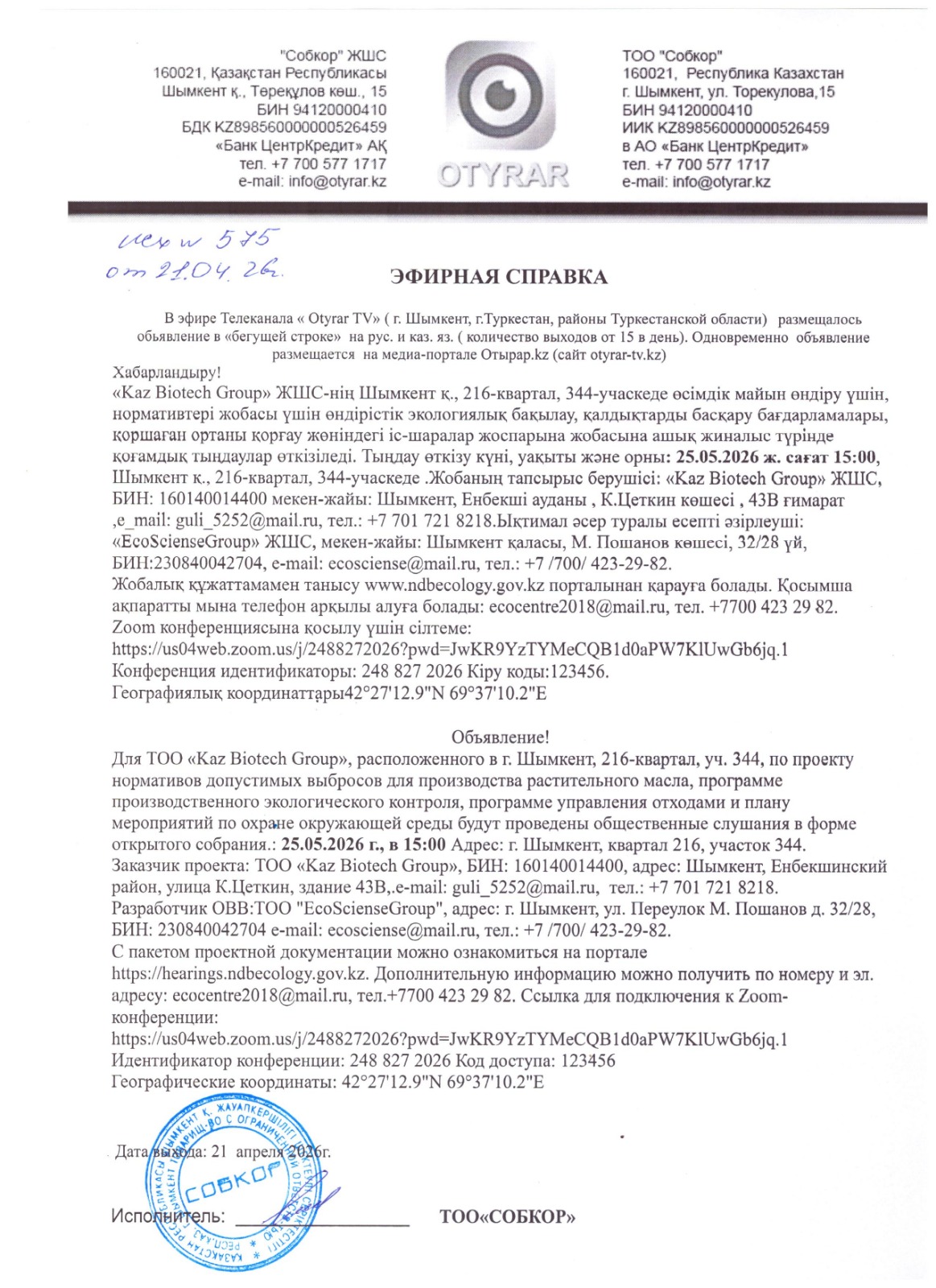 4. Повестка дня общественных слушаний: Настоящий проект нормативов допустимых выбросов для для производства растительного масла ТОО «Kaz Biotech Group» расположенного в уч.344 квартале 216 г.Шымкент. Как показали расчеты, выполненные в составе настоящего проекта при осуществлении планируемой деятельности, по всем выбрасываемым веществам, группам суммаций концентрации ни в одной расчетной точке не превышают ПДК (на границах области воздействия и границе жилой застройки). Результаты расчетов свидетельствуют о соблюдении гигиенических стандартов качества атмосферного воздуха по всем веществам, выбрасываемым источниками. Исходя из вышеизложенного и в соответствии с требованиями п. 8 «Методики определения нормативов эмиссий в окружающую среду» [3] эмиссии, осуществляемые при выполнении работ, предлагаются в качестве нормативов допустимых выбросов на каждый год деятельности. В соответствии с пп.10.12 п.10 Раздела 2 Приложения 1 к Экологиче-скому кодексу Республики Казахстан от 2 января 2021 года № 400-VI ЗРК, производство растительных и животных масел и жиров от 20 тыс. тонн в год входят в перечень видов намечаемой деятельности и объектов, для которых проведение процедуры скрининга воздействий намечаемой деятельности является обязательным. Предприятие относится согласно пп.4.1.2. п. 4 раздела 2 приложения 2 к Экологическому кодексу Республики Казахстан от 2 января 2021 года № 400-VI ЗРК 4.1.2. растительных и животных масел и жиров (с проектной производительностью менее установленных подпунктами 5.2.2 и 5.2.3 пункта 5.2 раздела 1 настоящего приложения) относится ко II категории. Режим работы предприятия круглогодичный и составляет 335 дней в году по 24 часа в сутки. Годовая производительность по переработке сырья в производстве растительного масла составляет: - семена сафлора – 95 000 тн./год, 283,6 тн/сутки. Выход масла составляет 19 000тн, в том числе: - сафлорового – 19 000 тн/год, 56,7 тн/сутки. Растительные отходы (020103) – в объеме 76 000 тн. передаются в спец. предприятиям (в сельское хозяйство). Всего на период эксплуатации предусмотрено 3 организованных и 8 неорганизованных источников загрязнения. Основными источниками выбросов загрязняющих веществ в атмосферу составляет. Источники выбросов по предприятию. Источник №0001 – очистительная машина (овсюгоотборник) Источник №0002 – очистительная машина (куколоотборник) Источник №0003 – теплогенератор. Источник №6001 – узел выгрузки шелухи. Источник №6002 – склад шелухи. Источник №6003 –приемный бункер Источник №6004 –сепаратор Источник №6005 – камнеотделительная машина Источник №6006 – вибро сепаратор Источник №6007 –накопительный бункер Источник №6008 – механическая мастерская Общий выброс загрязняющих веществ составляет 1,54534016 г/с, 21,52085 т/год. Как показывает анализ результатов расчетов, на границах санитарно-защитной зоны, жилой зоны, в пределах зоны воздействия и на контрольных точках превышение нормативных значений ПДК не наблюдается. Расчеты выполнены с учетом фонового загрязнения атмосферы (Приложение Б). Качественный и количественный состав выбросов загрязняющих веществ определѐнный данным проектом, предлагается в качестве нормативов ПДВ на 2026-2034 года. Год достижения норматива допустимых выбросов – 2026 г.