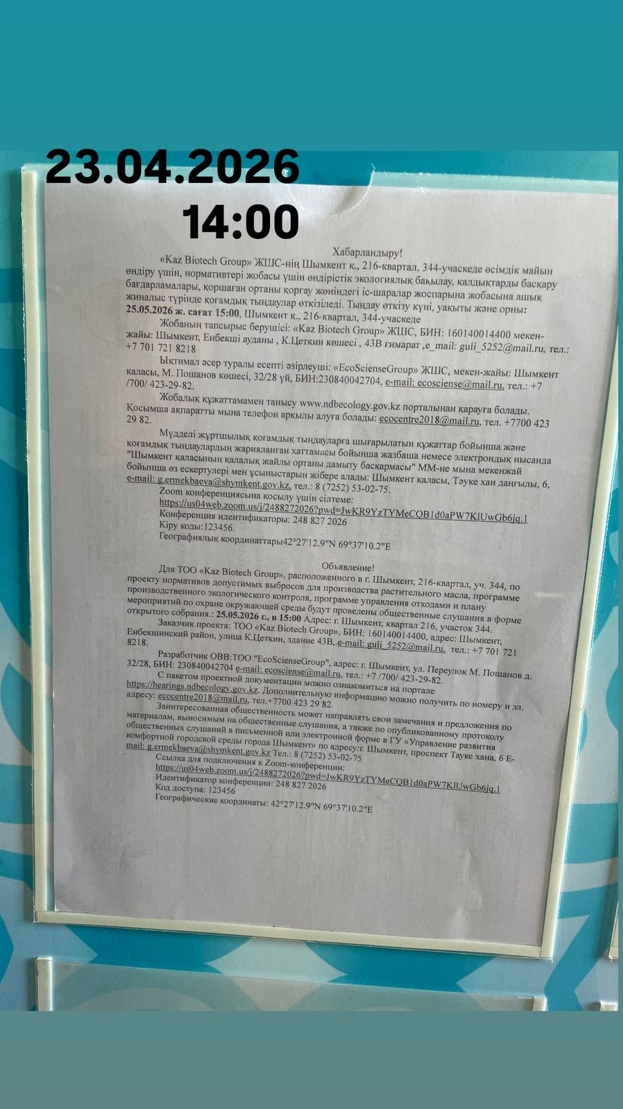 1.4. Описание для подключения к онлайн трансляции при прохождении общественного слушания: Конференция идентификаторы: 248 827 2026 Кіру коды:123456