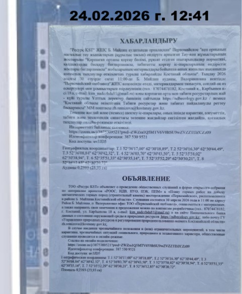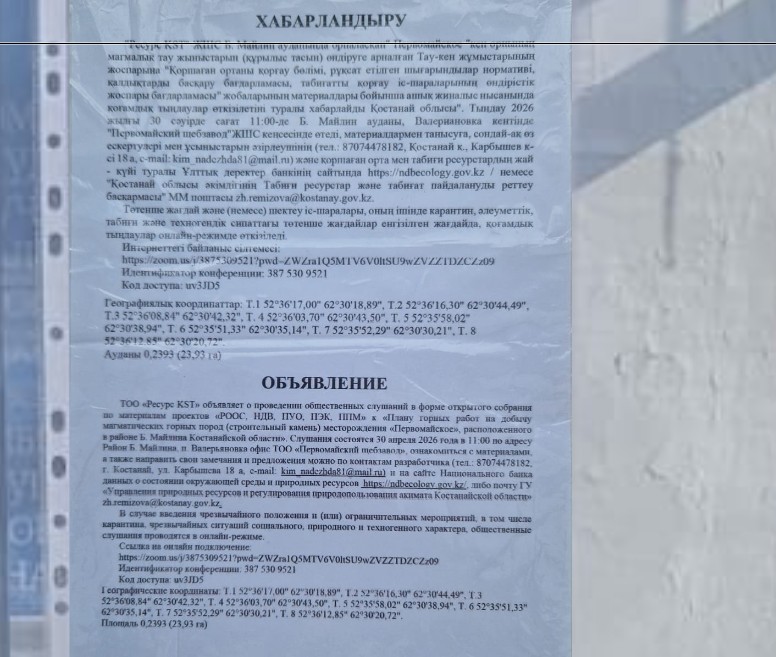 3. Общественные слушания организованны: Управление природных ресурсов и регулирования природопользования Костанайской области, zh.remizova@kostanay.gov.kz, 87142 546166,