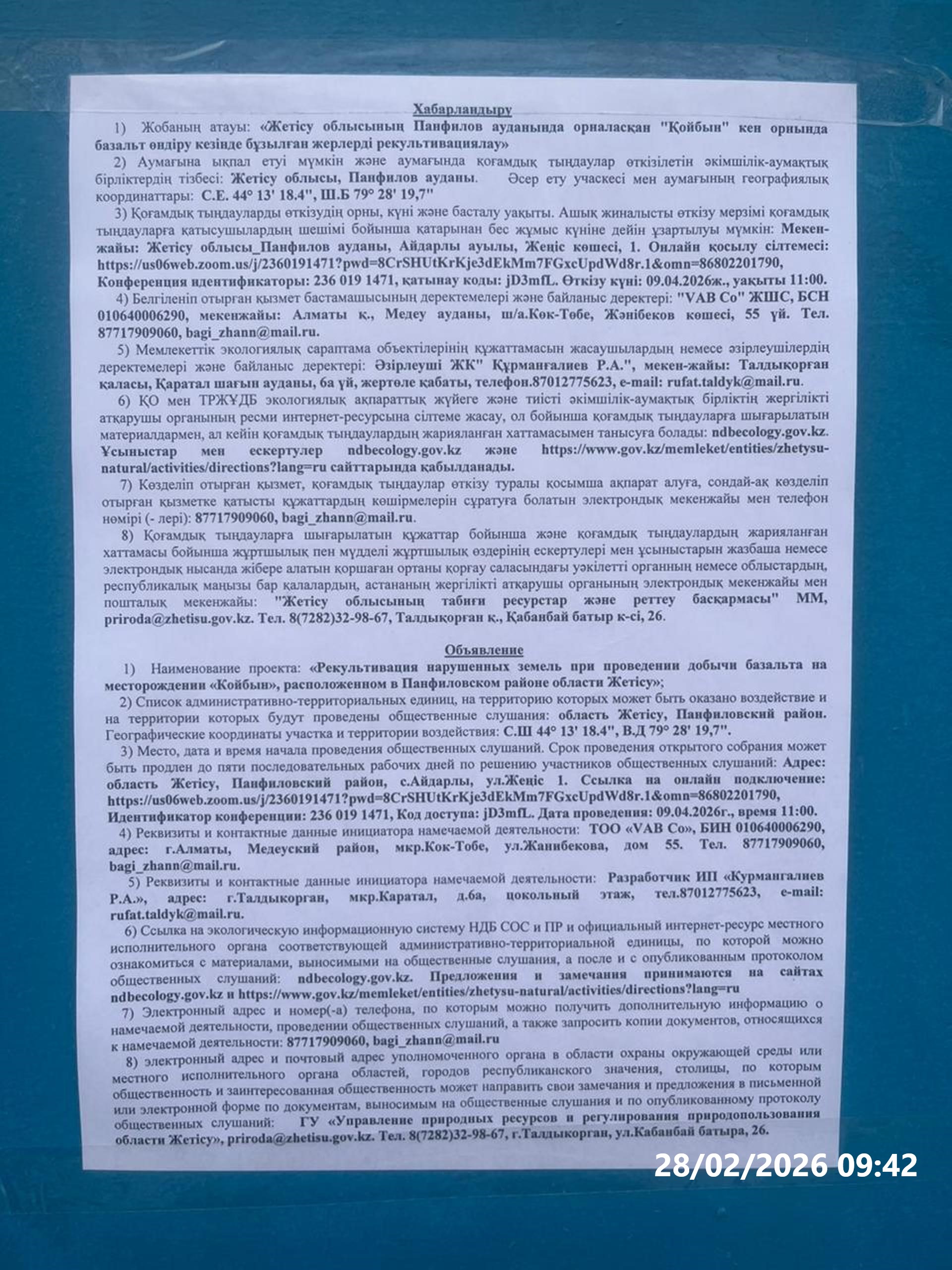 3. Общественные слушания организованны: Главный специалист УПР и ПР Жетысуйской области, priroda@zhetisu.gov.kz,