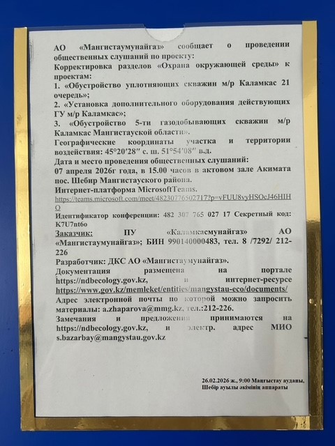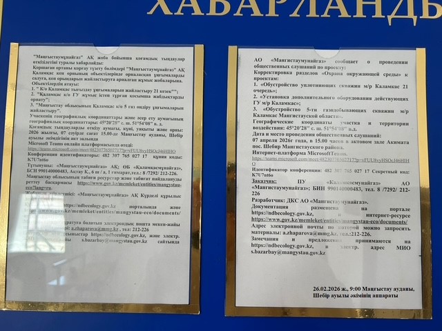 3. Общественные слушания организованны: Управление природных ресурсов и регулирования природопользования Мангистауской области, s.bazarbay@mangystau.gov.kz,