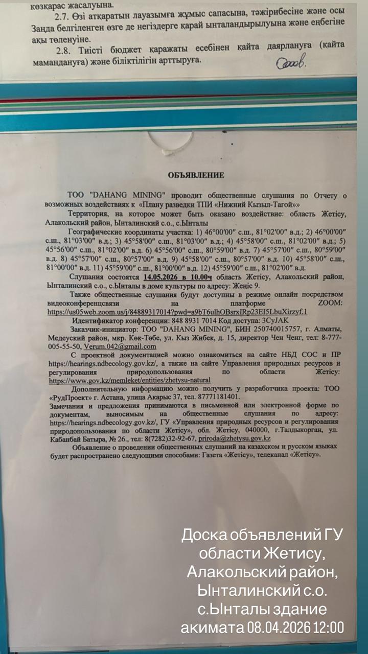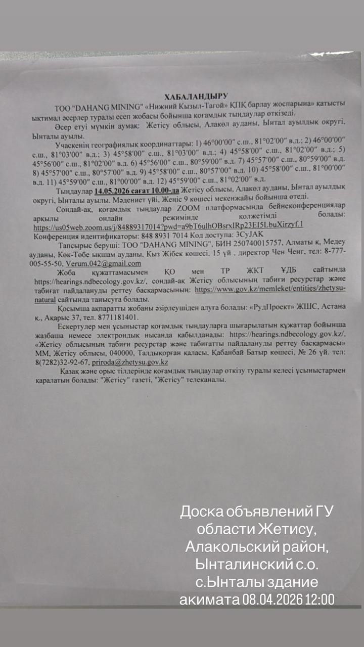 3. Общественные слушания организованны: Главный специалист УПР и ПР Жетысуйской области, priroda@zhetisu.gov.kz,