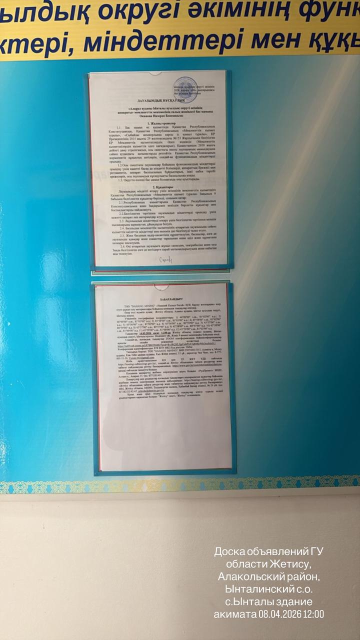 6.3. расположение мест, специально предназначенных для Размещения печатных объявлений (доски объявлений): доска объявлений ГУ "Аппарат акима Ынталинского сельского округа Алакольского района"